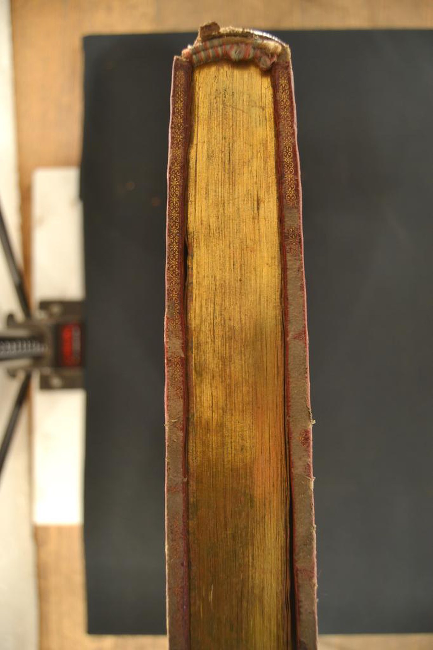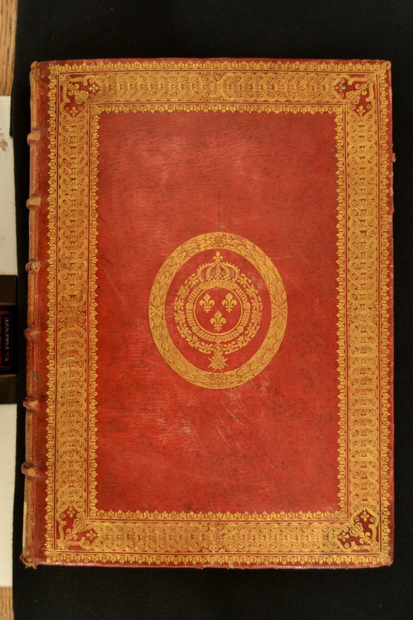 Cuoio di capra rosso su quadranti in cartone decorato in oro. Cornice caratterizzata da coppie di rosette entro motivi a torciglione affiancati da archi fogliati; gigli sormontati da corona reale negli angoli. Armi (117x105 mm) reali di Francia. Scompartimenti del dorso riquadrati. Nel secondo, il nome dell’autore e il titolo dell’opera; grottesche e giglio coronato centrale in quelli residui. Capitelli muniti di doppia anima circolare avvolta da fili in seta rossa, verde e bianca. Cucitura su sei nervi rilevati. Indorsatura realizzata tramite alette orizzontali cartacee. Labbri ornati a pizzo. Rimbocchi discretamente rifilati. Contropiatti provvisti di punte zigrinate lungo i margini. Carte di guardia marmorizzate policrome del genere caillouté e bianche. Tagli dorati brillanti. Stato di conservazione: discreto. Spellature al materiale di copertura, specie al piede.