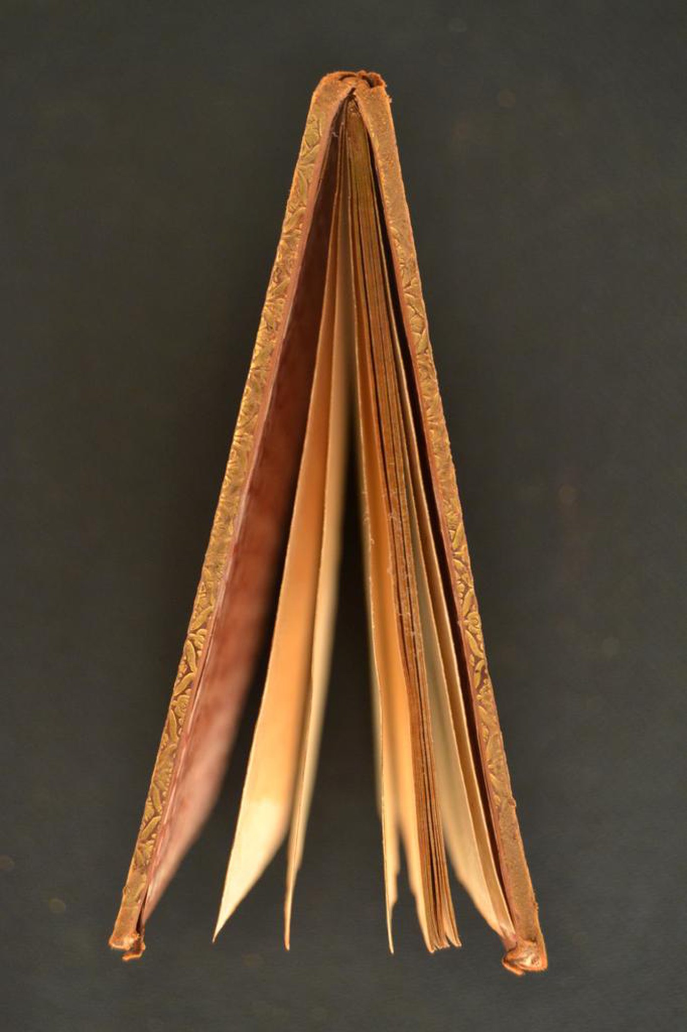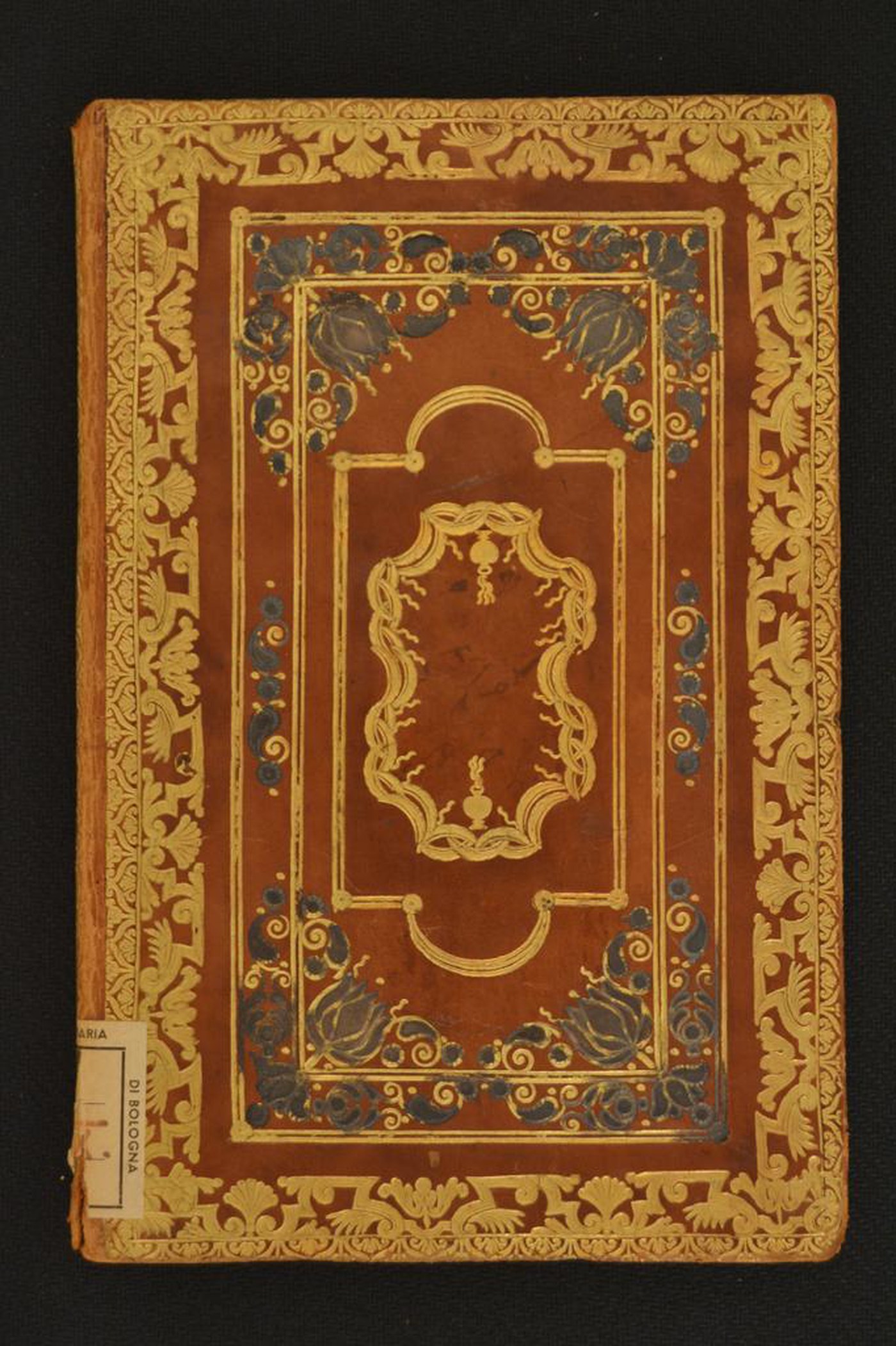Cuoio di vitello marrone su quadranti in cartone decorato in oro e a colore. Cornici concentriche caratterizzate da fogliami svasati sormontati da cuspidi (motivi ripresi lungo il dorso liscio), palmette alternate a corolle stilizzate entro nastri, volute caudate, cerchielli filigranati, ampi tulipani rilevati in pasta di colore blu. Coppia di cartelle a filetti spezzati collegati da cerchiello in punta d’angolo e ad archi incrociati, quest’ultima provvista di un paio di vasi fiammati. Scompartimenti del dorso riquadrati. Capitelli assenti. Cucitura su tre nervi. Indorsatura realizzata tramite alette orizzontali cartacee. Labbri ornati a pizzo. Rimbocchi rifilati senza cura particolare. Carte di guardia silografate rosse su sfiondo bianco a raffigurare seminato di stelle a sei bracci alternate a quadrangoli e bianche. Tagli dorati brillanti incisi. Stato di conservazione: discreto. Materiale di copertura dalla tonalità scolorita lungo il dorso.
