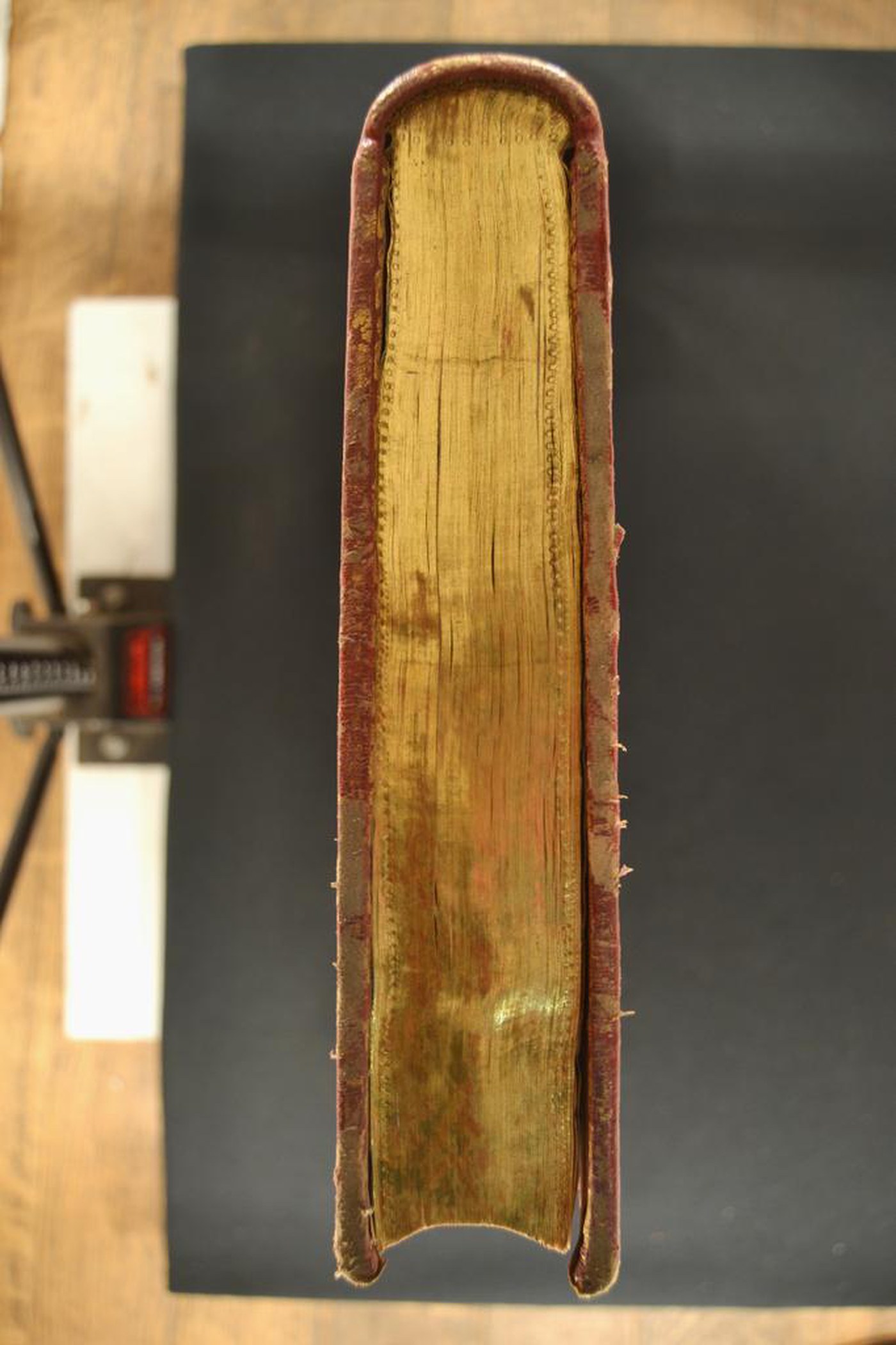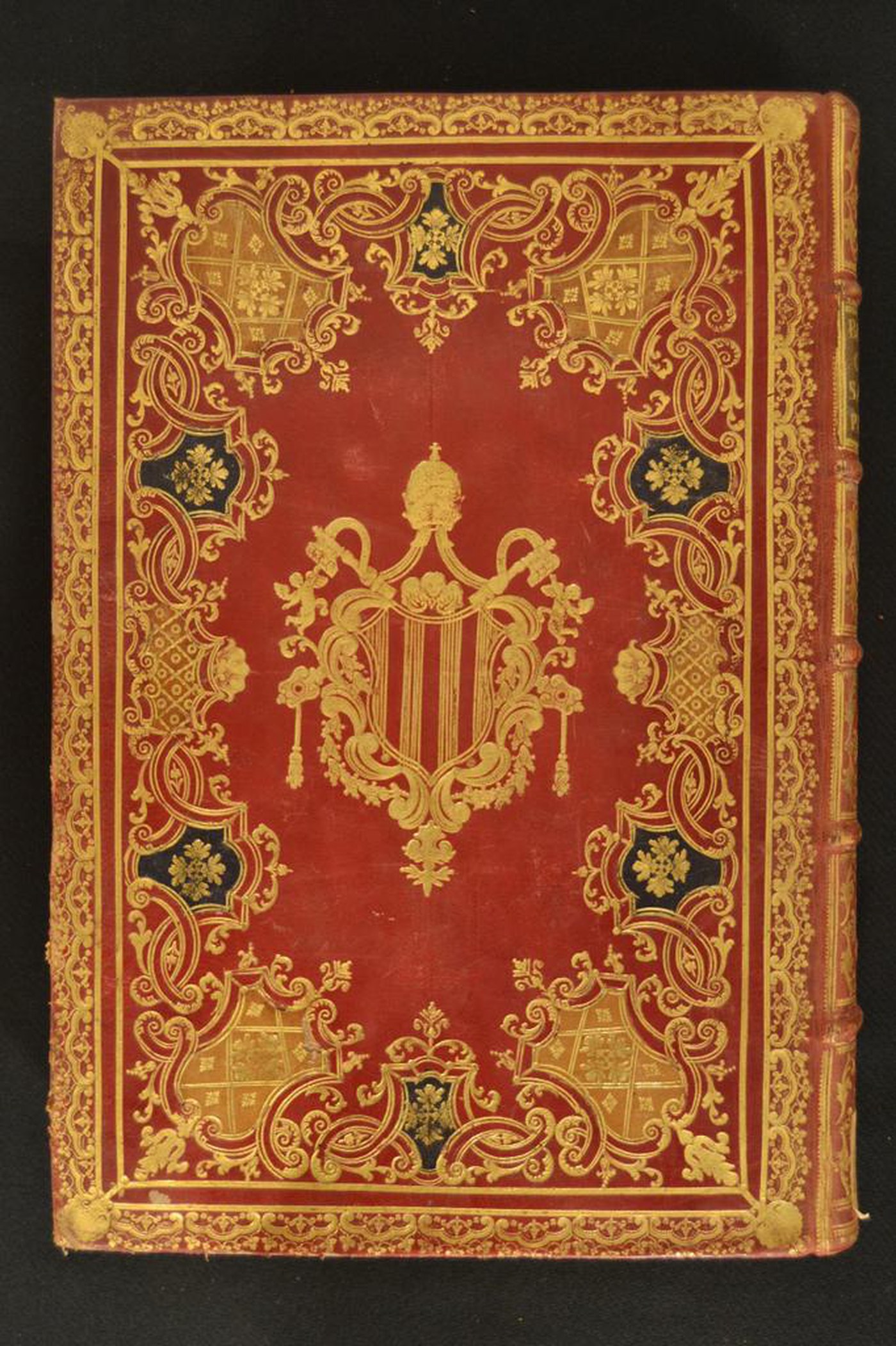 Cuoio di capra rosso su quadranti in cartone decorato in oro e a colore. Due cornici caratterizzate da fogliami trilobati sormontati da nastri a filetti spezzati e archi filigranati congiuntamente a conchiglie. Margini interni dello specchio provvisti di corolle trilobate, nastri incrociati a formare scompartimenti rilevati nei colori nocciola e verde, fronde mosse, corolle stilizzate dal pistillo filigranato, volute fogliate, tralicci. Armi (105x90 mm) riferibili al pontefice Benedetto XIV (1740-1758). Scompartimenti del dorso riquadrati. Nel secondo e terzo, il titolo dell’opera e la partizione del volume entro il corame verde; due fogliami mossi negli angoli interni e quattro palmette addossate centrali in quelli residui. Capitelli muniti di anima circolare avvolta da fili in seta rossa e dorati. Cucitura su cinque nervi rilevati. Indorsatura realizzata tramite alette orizzontali cartacee. Labbri e margini dei contropiatti ornati con fogliami. Rimbocchi rifilati senza particolare cura. Carte di guardia marmorizzate policrome pettinate e bianche. Tagli dorati brillanti incisi marmorizzati. Stato di conservazione: discreto. Materiale di copertura spellato al piede dei piatti.