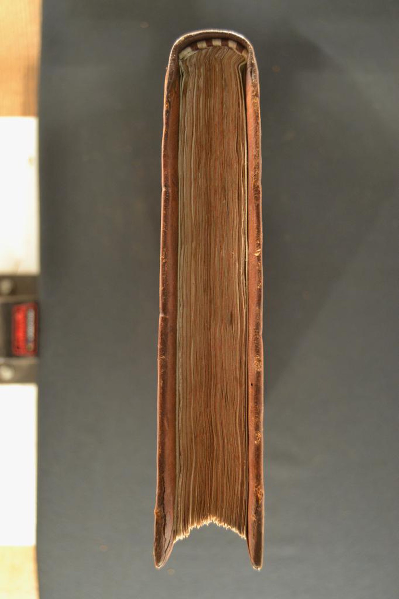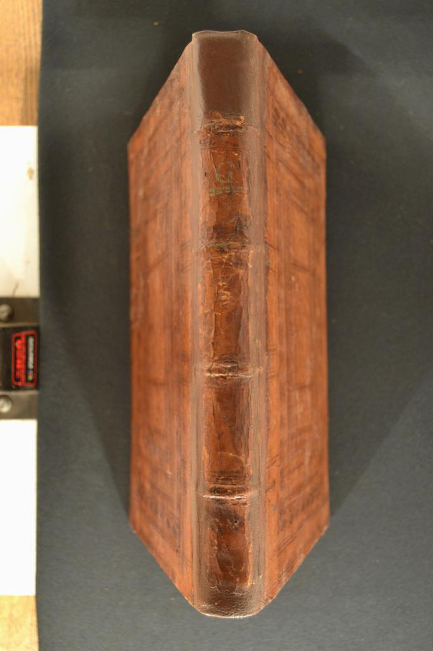 Cuoio di bazzana marrone su assi lignee smussate ai contropiatti in corrispondenza dei tagli, decorato a secco. Filetti concentrici. Cornici mediana e interna caratterizzate da coppie di archi sormontati da fogliami svasati e testine antropomorfe di profili entro ovali e fogliami. Specchio munito di due rettangoli. Tracce di due fermagli. Capitelli, indorsatura, rimbocchi e carte di guardia (parzialmente) rinnovati. Cucitura su quattro nervi rilevati. Tagli rustici. Stato di conservazione: mediocre. Materiale di copertura stropicciato, parzialmente scomparso. Restauro Pietro Gozzi, Modena, 1980.