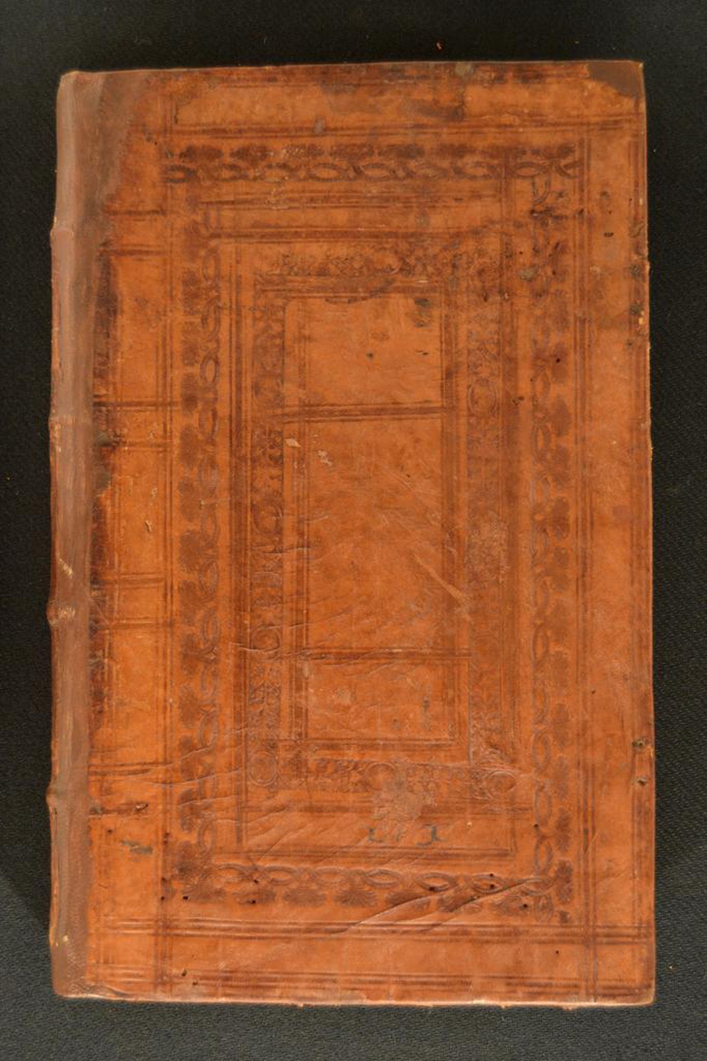L’impianto ornamentale, la coppia di rettangoli, i fregi e le note tipografiche propongono di assegnare la legatura, al primo quarto del XVIII secolo, eseguita nei Paesi Bassi. In evidenza i tagli smussati ai contropiatti e il frontespizio illustrato. Volume donato da Clemente XIII nel 1761.