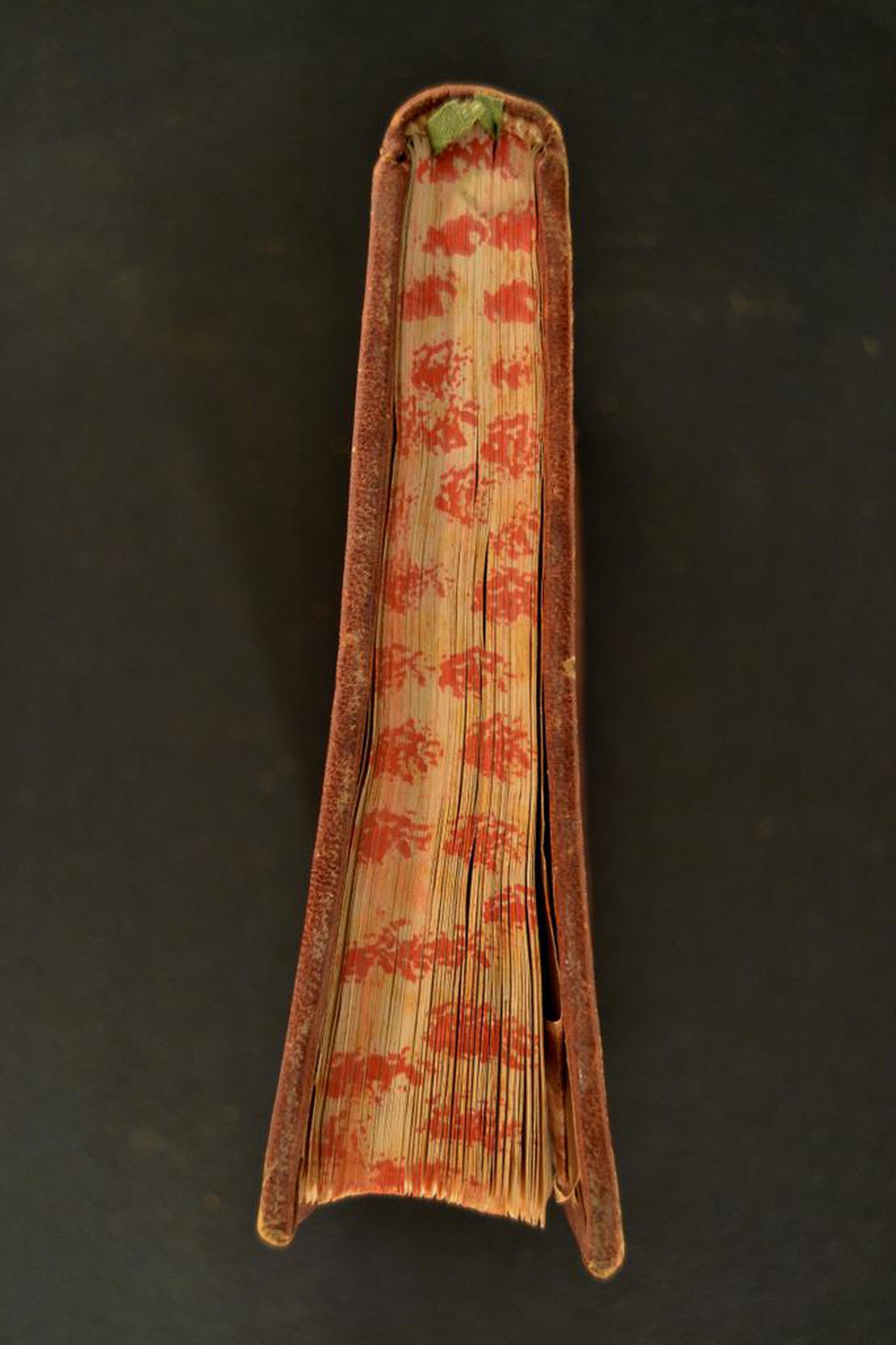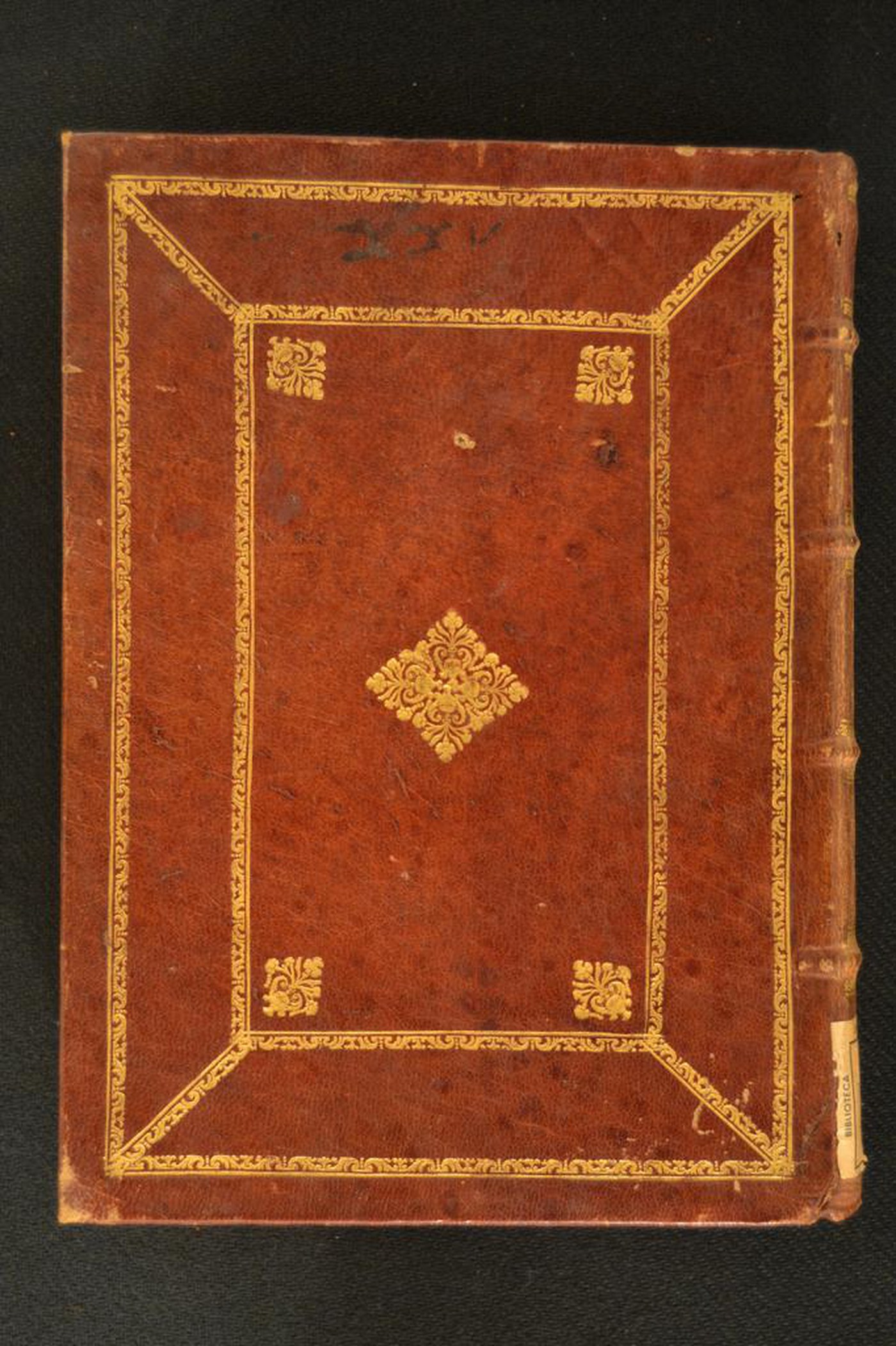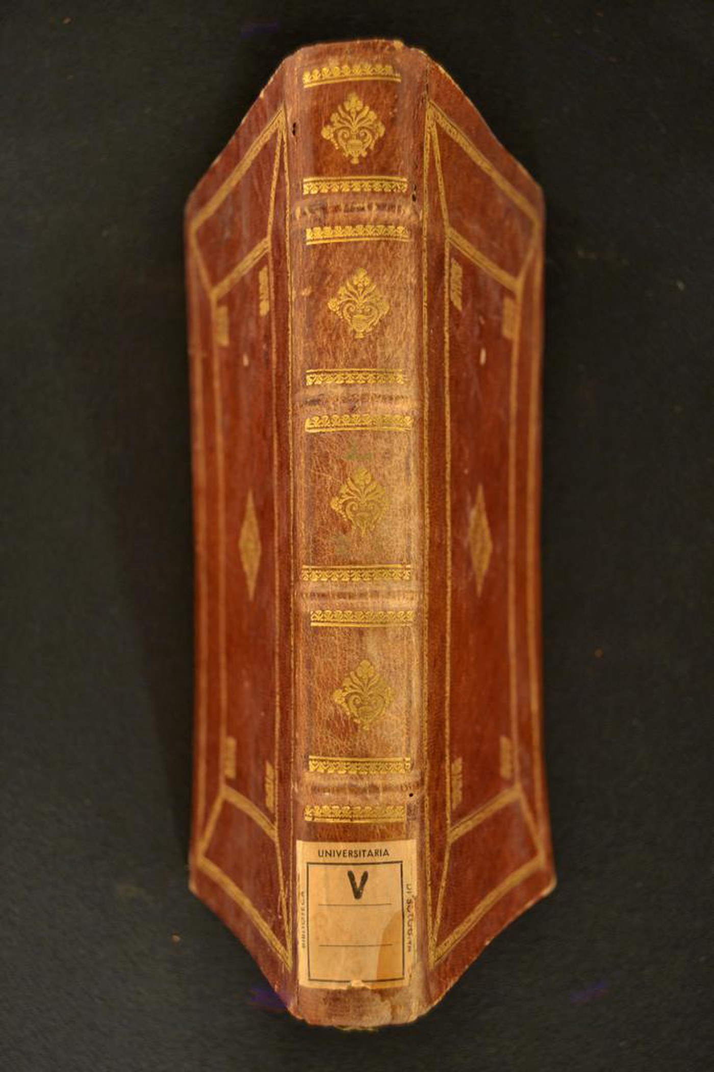 Cuoio di capra marrone su quadranti decorato in oro. Coppia di cornici concentriche fogliate. Minuto vaso fiorito negli angoli interni dello specchio, ripresi quattro volte addossati nella cartella centrale e singolarmente al centro degli scompartimenti del dorso. Capitelli muniti di anima circolare avvolta da fili in canapa. Cucitura su quattro nervi rilevati. Indorsatura realizzata tramite alette orizzontali cartacee. Labbri muti. Rimbocchi rifilati senza particolare cura. Carte di guardia silografate policrome a raffigurare fogliami, fiorami e bianche. Tagli rustici spugnati di rosso. Segnacolo in tessuto verde. Stato di conservazione: discreto. Marginali spellature. Diffuse bruniture al materiale di copertura dalla tonalità scolorita lungo la costola. Piatto anteriore sollevato.