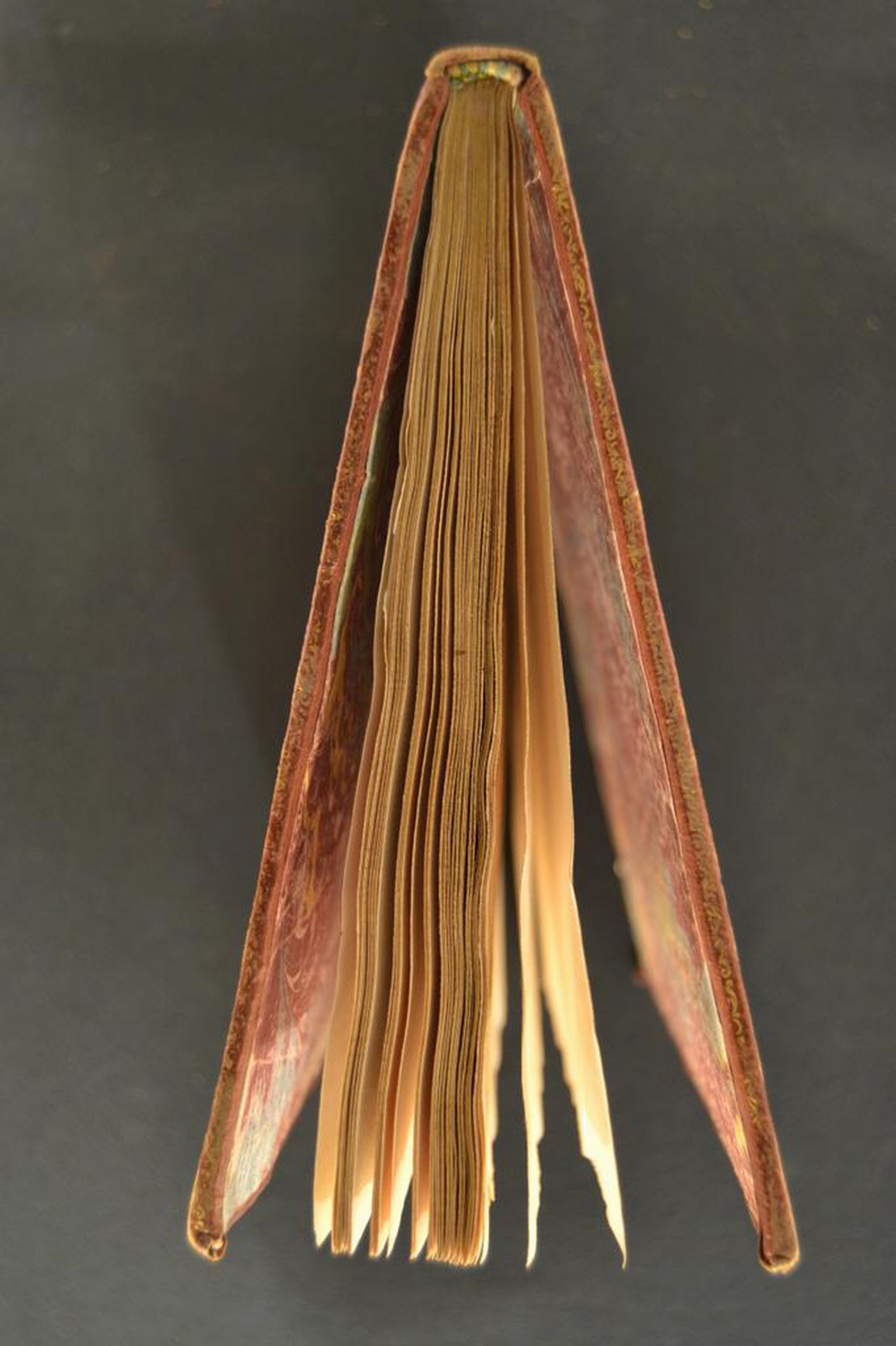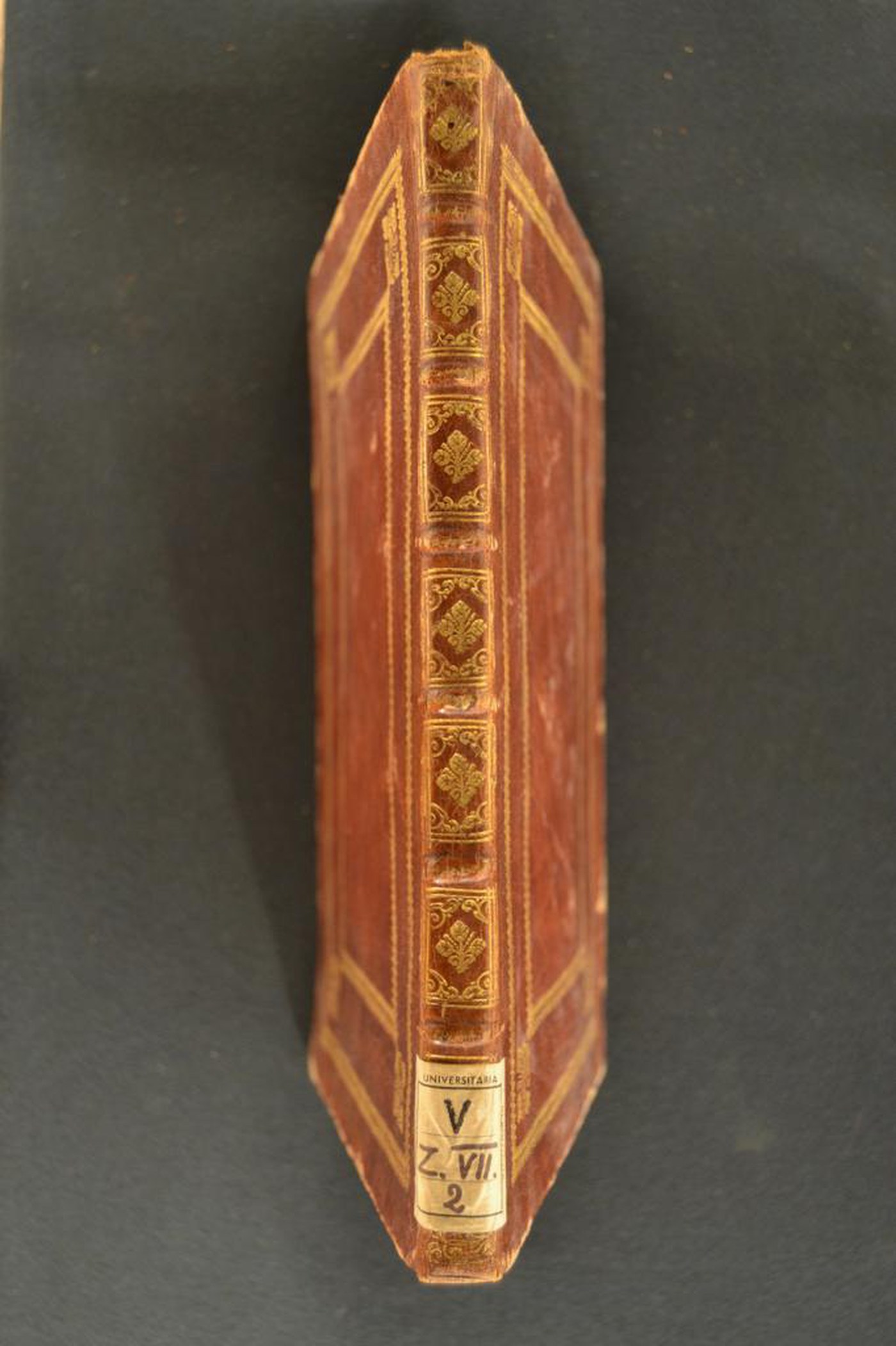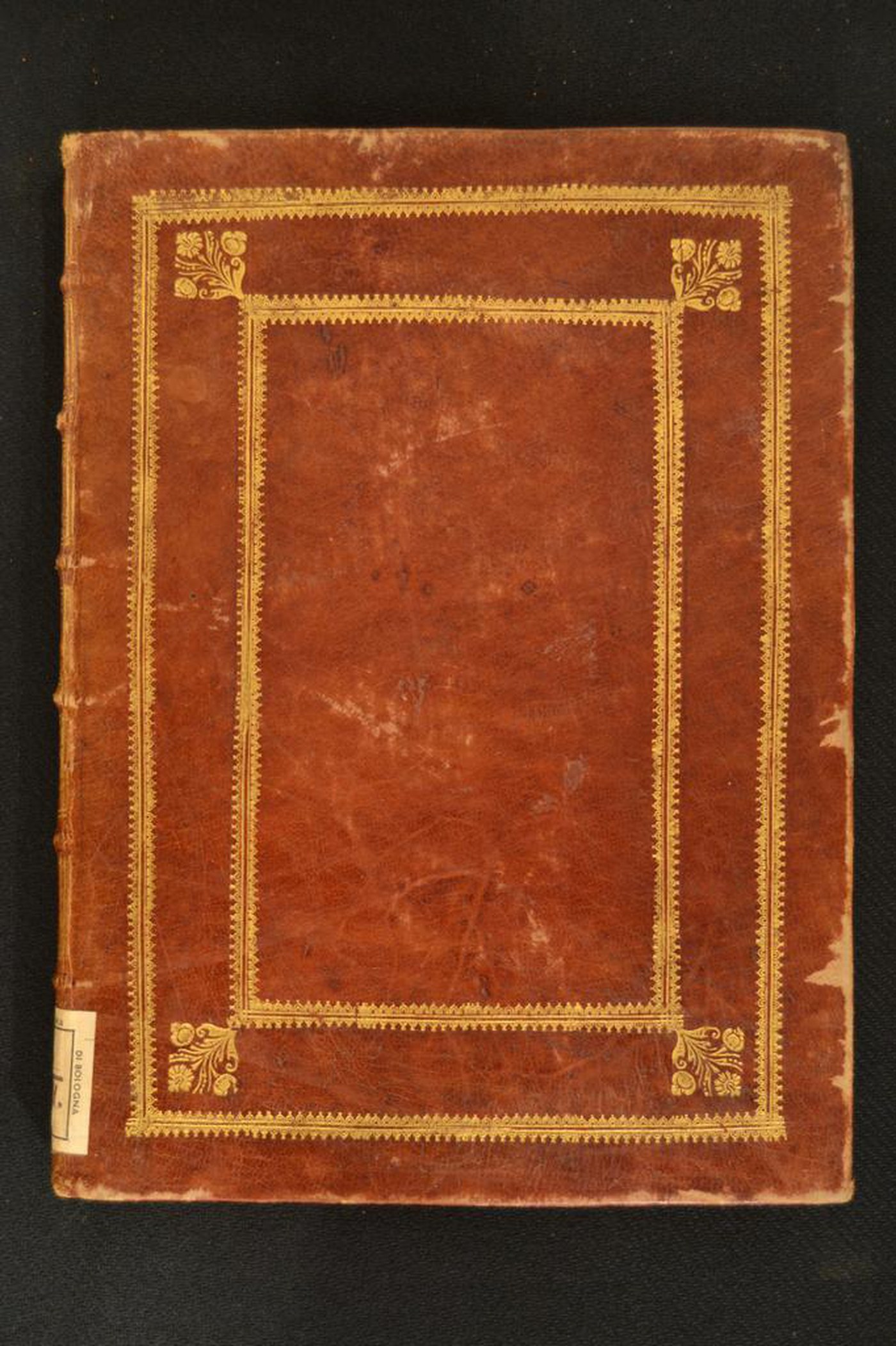 Cuoio di bazzana marrone su quadranti in cartone decorato in oro. Due cornici concentriche provviste di monticelli. Fiorami negli angoli esterni del riquadro interno entro base quadrangolare. Scompartimenti del dorso riquadrati; voluta negli angoli interni e fregio fitomorfo centrale entro base losangata in quelli residui. Capitelli muniti di anima circolare avvolta da fili in seta verde e bianca. Cucitura su sei nervi rilevati. Indorsatura realizzata mediante alette orizzontali cartacee. Labbri ornati con minute fronde. Rimbocchi rifilati senza particolare cura. Contropiatti rivestiti da foglio in carta marmorizzata policroma pettinata. Carte di guardia bianche. Tagli dorati. Stato di conservazione: discreto. Spellature e bruniture al materiale di copertura. Angoli ricurvi.