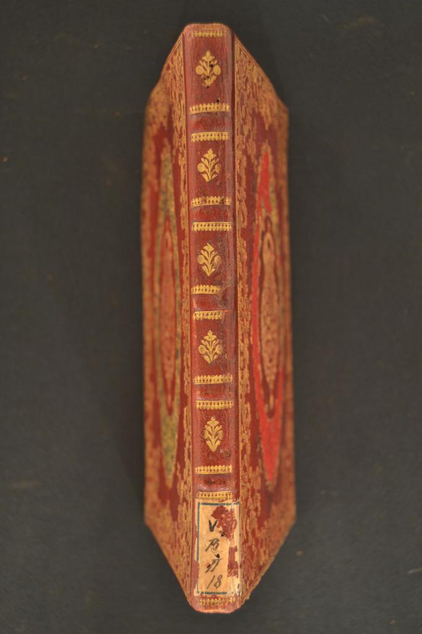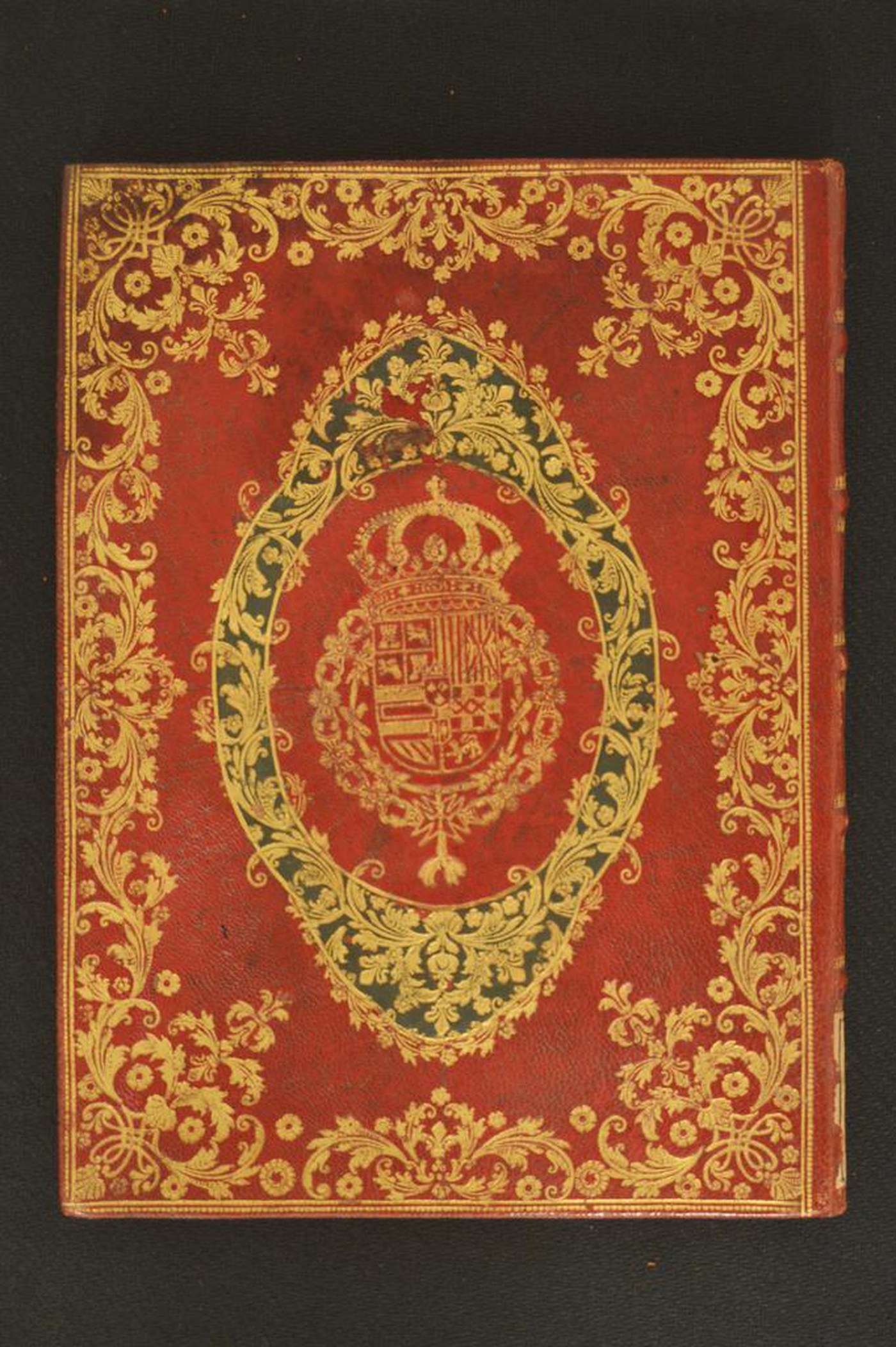 Cuoio di capra rosso su quadranti in cartone decorato in oro e a mosaico in colore verde. Cornice a filetto filigranato e continuo. Palmette, fronde mosse, rosette, gigli, fiorami, motivi ripresi lungo l’ampia cartella colorata circostanti le armi (90x50 mm) riferibili a Ferdinando VI (1746-1759). Fregio fitomorfo centrale negli scompartimenti del dorso. Capitelli assenti. Cucitura su cinque nervi rilevati, ciascuno evidenziato in testa e al piede da banda orizzontale di ornamenti stilizzati. Indorsatura realizzata tramite alette orizzontali cartacee. Labbri ornati con corolle stilizzate filigranate. Rimbocchi rifilati senza particolare cura. Carte di guardia in tessuto blu e bianche. Tagli dorati brillanti. Stato di conservazione: discreto. Bruniture al materiale di copertura, parzialmente scomparso in corrispondenza del mosaico.