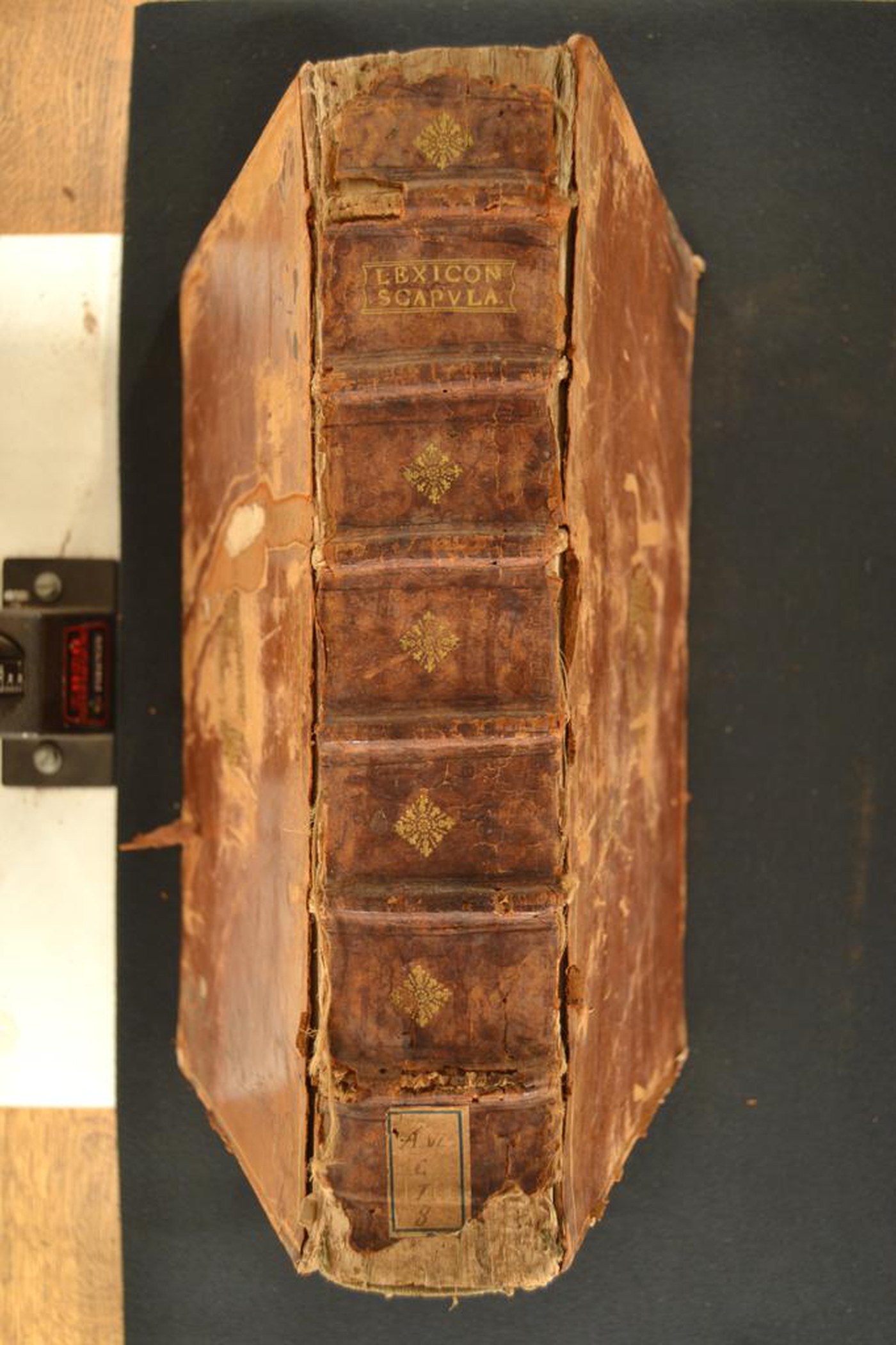 Scapula, Johann <fl. 1580>, Lexicon Graecolatinum denuo vltra praecedentes editiones, innumeris dictionibus, e probatis autoribus petitis, locupletatum, Ioannis Scapulae. Duplici methodo constans: vna naturali, eaque ditissimis Graecae linguae thesauris breui facileque comparandis aptissima, qua ex primitiuorum & simplicium fontibus deriuata atque composita dilucide deducuntur: altera mere alphabetica adscriptis numeris, qua, tanquam indice, minus exercitatis ostenditur, vbi in illa naturali methodo singulae voces inueniantur, ... Accesserunt opuscola perquam necessaria, de dialectis, de inuestigatione thematum, & alia. Accessit & index earum vocum quibus haec editio vltra precedentes locupletata fuit, Aureliae Allobrogum (Ginevra) : apud Gabrielem Carterium : sumptibus Caldorianis, 1609, 368x221x75 mm.