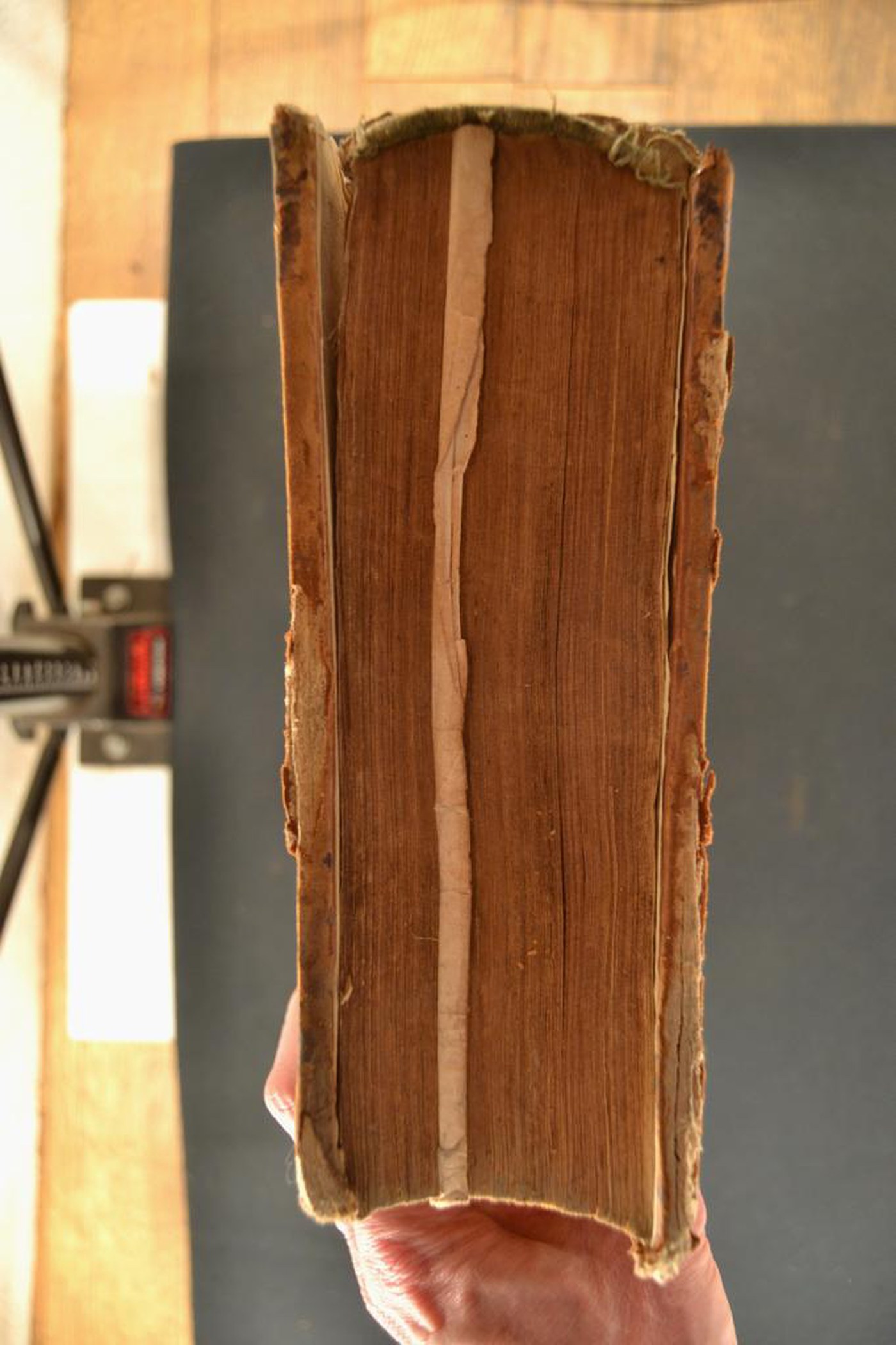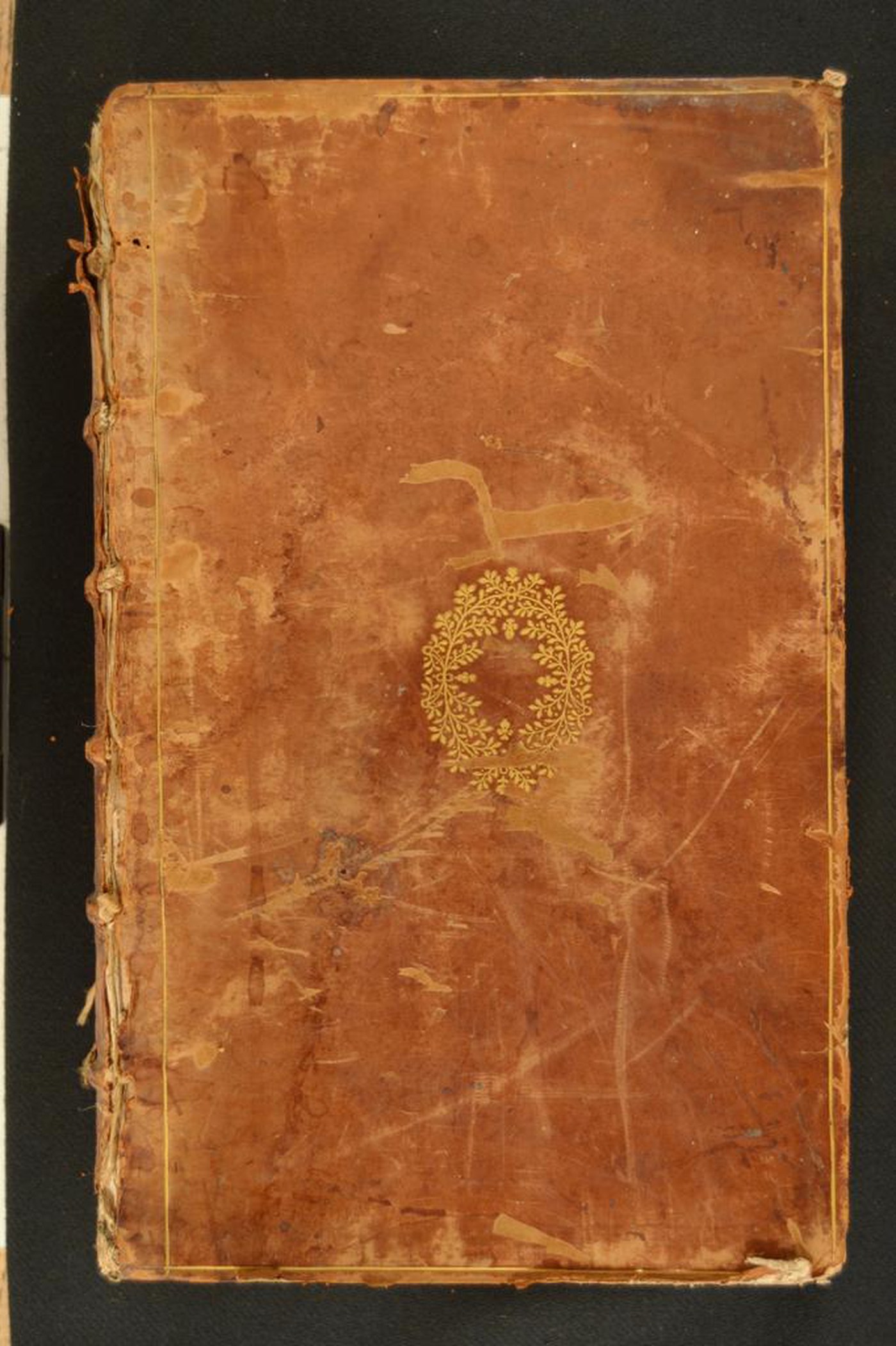 Cuoio di vitello marrone su quadranti in cartone decorato in oro. Cornice a filetto. Placca centrale (70x50 mm) a rami fronzuti. Nel secondo scompartimento del dorso, la cartella dai margini arcuati con il titolo dell’opera e il cognome dell’autore; rosetta entro serie di corolle stilizzate addossate e perle degradanti in quelli residui. Capitello di testa scomparso, in canapa al piede. Cucitura su sei nervi rilevati pelle allumata ricamata. Indorsatura realizzata tramite alette cartacee sotto forma di trapezio. Labbri muti. Rimbocchi rifilati senza particolare cura. Carte di guardia bianche. Tagli rustici. Stato di conservazione: pessimo. Diffuse spellature al materiale di copertura. Piatto posteriore avulso dal blocco. Supporto in vista. Angoli ricurvi e sbrecciati.