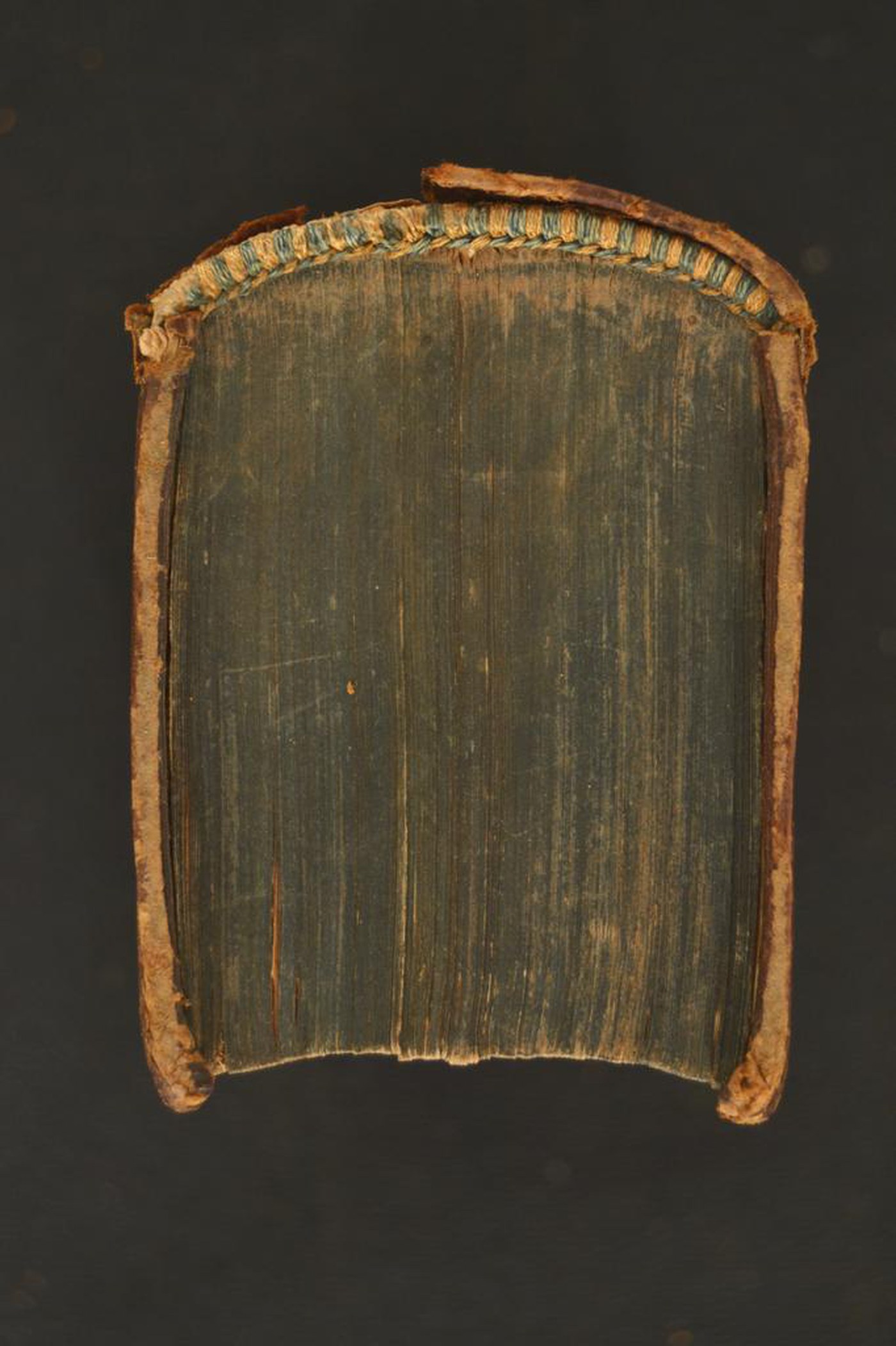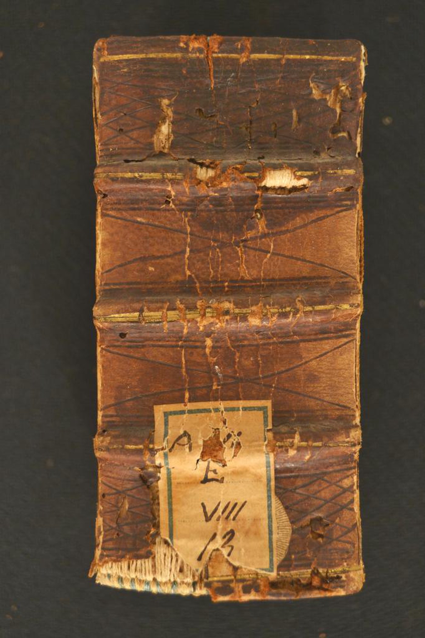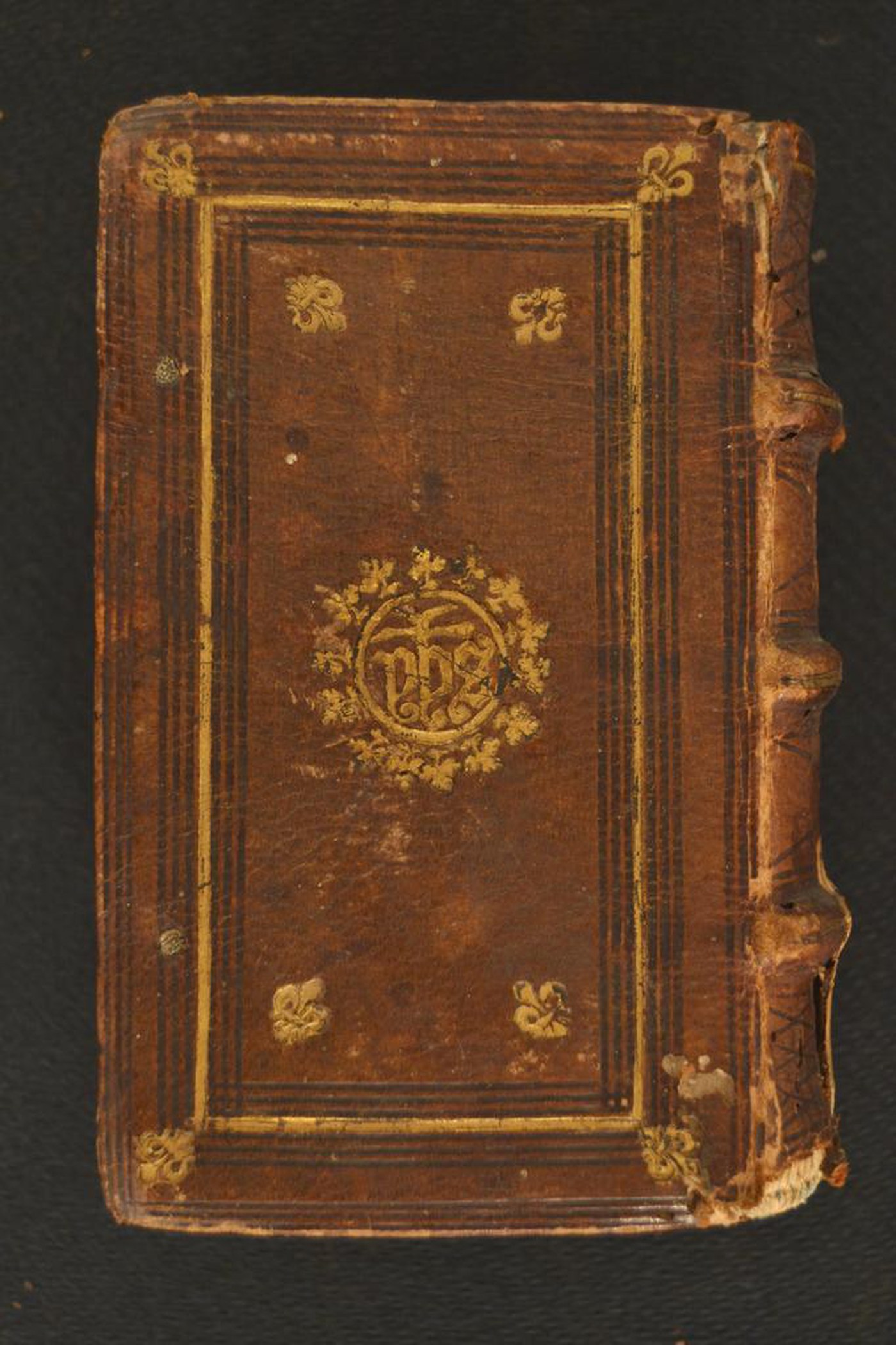 Cuoio di capra bruno su quadranti in cartone decorato a secco e in oro. Filetti concentrici. Giglio negli angoli del riquadro dorato. Cartella centrale provvista del monogramma «IHS» entro sfondo circolare e serto di fogliami trilobati. Tracce di quattro lacci in velluto. Scompartimenti del dorso caratterizzati da due filetti incrociati. Capitelli muniti di anima circolare avvolta da fili in canapa e in lino azzurro. Cucitura su tre nervi rilevati. Indorsatura realizzata tramite alette membranacee o cartacee orizzontali. Labbri muti. Rimbocchi rifilati senza particolare cura. Carte di guardia bianche. Tagli blu. Stato di conservazione: discreto. Materiale di copertura parzialmente assente al piatto anteriore e al dorso. Cerniere indebolite. Angoli ricurvi.
