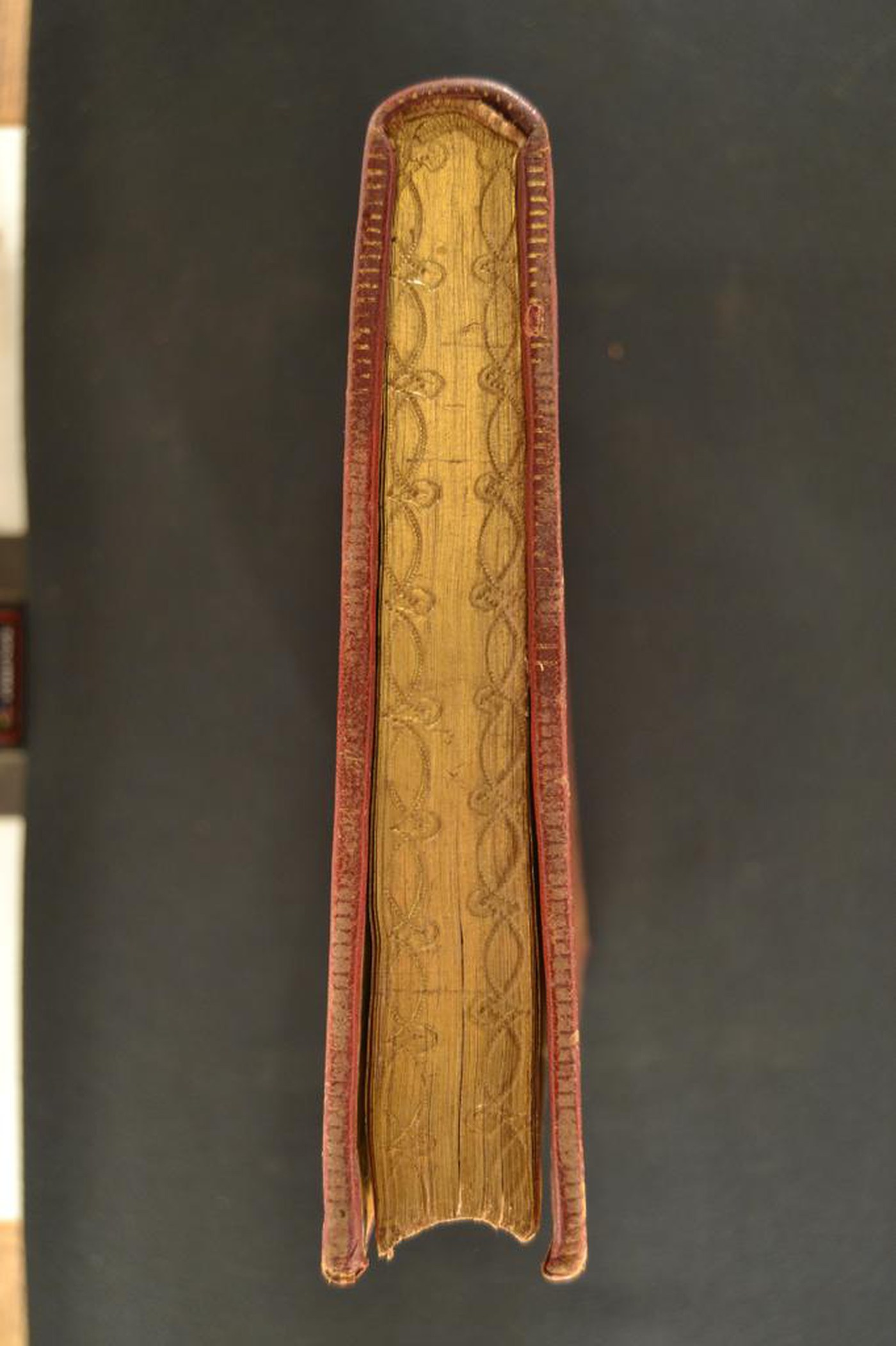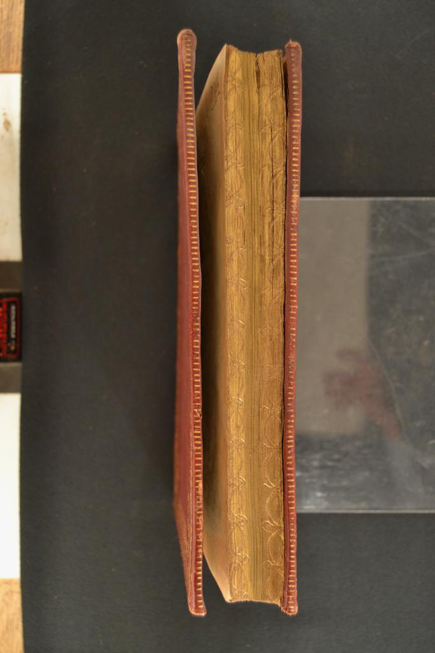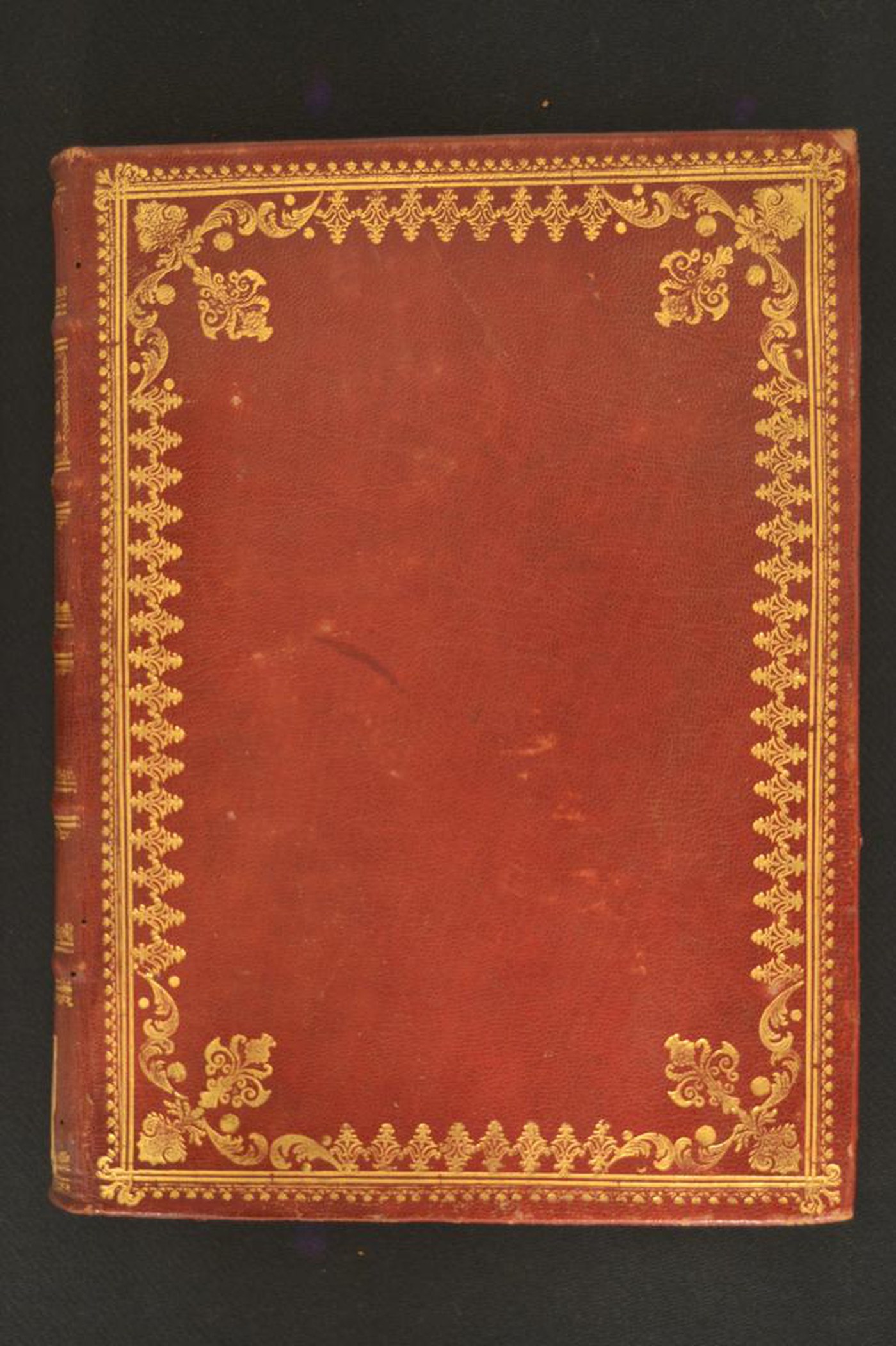 Cuoio di capra rosso su quadranti in cartone decorato in oro. Cornice caratterizzata da archetti sormontati da corolle stilizzate e due filetti. Margini interni dello specchio provvisti di tralicci, fronde mosse, cerchielli pieni, motivi stilizzati. Nel secondo scompartimento del dorso arrotondato, il cognome dell’autore e il titolo dell’opera; motivo stilizzato centrale in quelli residui. Capitelli muniti di anima circolare avvolta da fili in canapa e in lino verde. Cucitura su cinque nervi rilevati. Indorsatura realizzata tramite alette orizzontali cartacee. Labbri ornati con segmenti di filetti verticali. Rimbocchi rifilati senza particolare cura. Contropiatti rivestiti da foglio in carta marmorizzata del genere caillouté. Carte di guardia bianche. Tagli dorati brillanti incisi. Stato di conservazione: discreto. Marginali spellature al materiale di copertura.