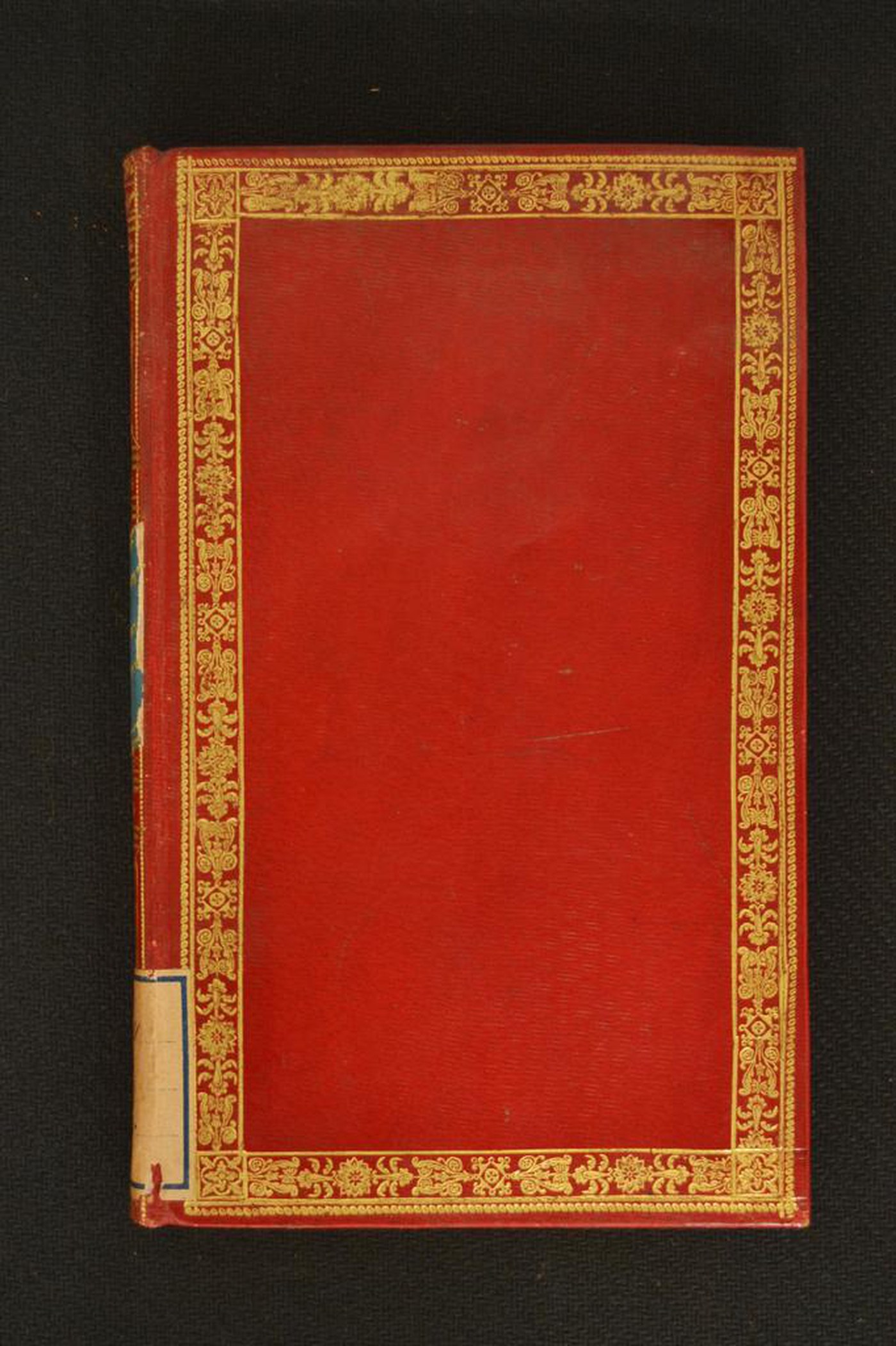Cuoio rossa a grana lunga su quadranti in cartone decorato in oro. Cornice caratterizzata da motivi fitomorfi. Specchio muto. Scompartimenti del dorso riquadrati. Nel secondo, il titolo dell’opera entro il tassello diagonale in carta azzurra; motivi fitomorfi in quelli residui. Capitelli costituiti da fili in seta rossa e bianca incrociati. Cucitura su quattro nervi. Indorsatura realizzata tramite aletta orizzontale cartacea. Labbri ornati con palmette. Rimbocchi accuratamente rifilati. Margini dei contropiatti ornati con cerchielli muti collegati a mezzo di filetti. Carte di guardia in tessuto turchese e bianche. Tagli dorati brillanti. Stato di conservazione: discreto. Gore grigie al piatto anteriore.