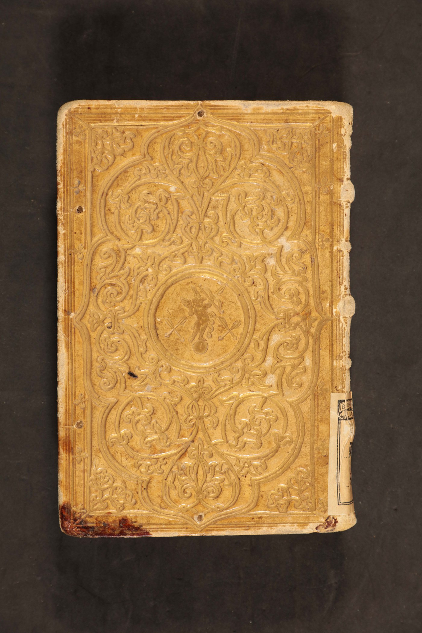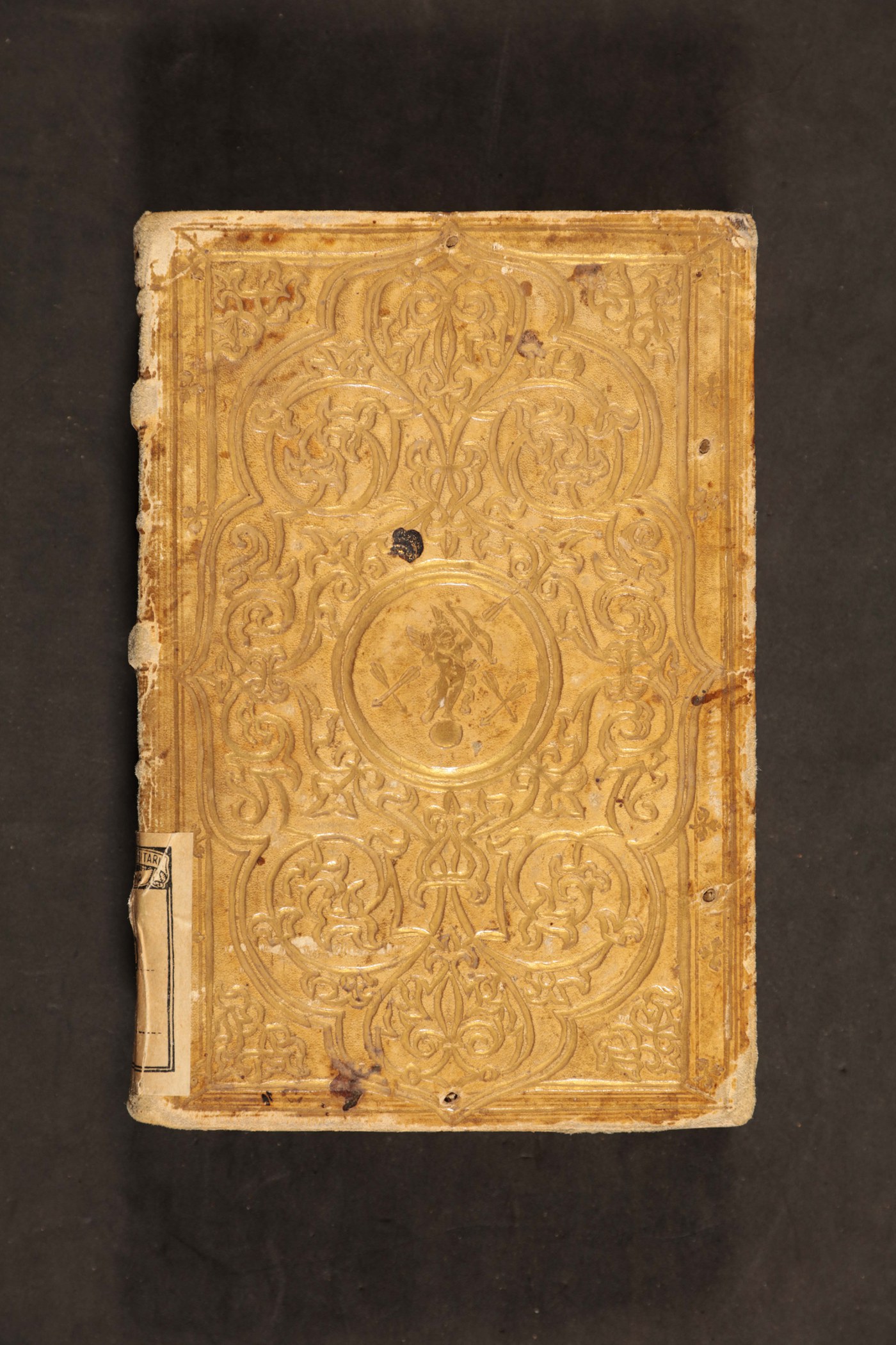 Cuoio di vitello avoriato su quadranti in cartone decorato in oro. Cornice costituita da fascio di filetti a delimitare l’ornamento di gusto orientaleggiante realizzato a placca; al centro Cupido bendato su di una sfera tra due coppie di frecce incrociate. Tracce di quattro coppie di lacci. Capitelli in canapa. Cucitura su tre nervi in pelle allumata alternati a quattro apparenti. Indorsatura realizzata tramite alette orizzontali membranacee. Labbri muti. Rimbocchi rifilati senza particolare cura. Carte di guardia bianche. Tagli dorati incisi; al piede l’iscrizione manoscritta riferibile al titolo dell’opera. Stato di conservazione: mediocre - discreto. Bruniture e spellature al materiale di copertura, queste ultime specie lungo il dorso. Angoli Incurvati.