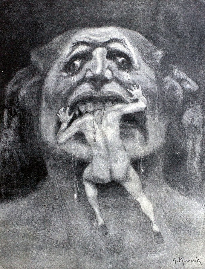 Il mostro piange con sei occhi e le sue lacrime gocciolano lungo i suoi tre menti, mescolandosi a una bava sanguinolenta.