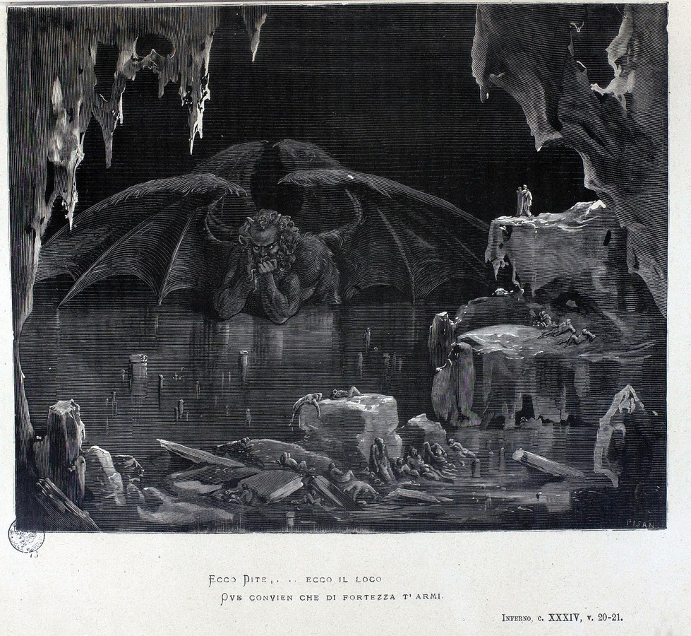 Dante descrive Lucifero come un essere gigantesco posto in condizioni di sostanziale impotenza, conficcato al centro della terra nella medesima posizione in cui si ritrovò dopo la caduta fitto è ancora sì come prim'era (Inf. XXXIV, 120).