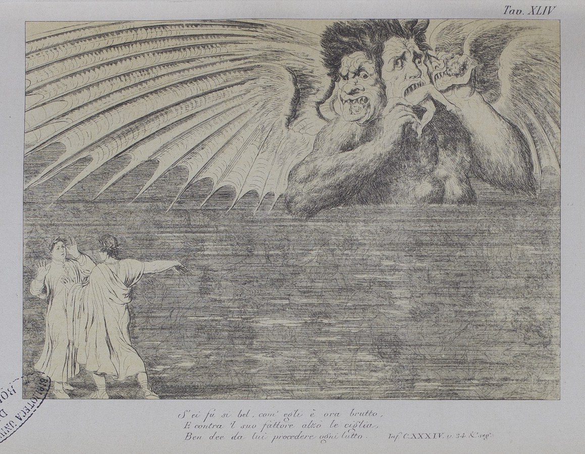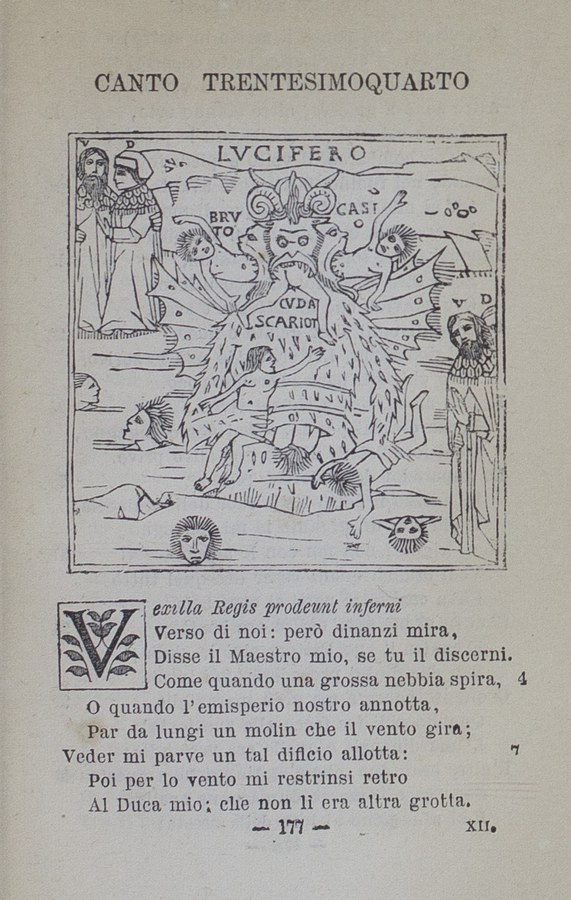 L'imperatore dell'inferno esce dal ghiaccio di Cocito dalla cintola in su e c'è maggior proporzione tra Dante e un gigante che non tra un gigante e le braccia del mostro, per quanto sia smisurato. Se Lucifero fu tanto bello quanto adesso è brutto, osserva Dante, e nonostante ciò osò ribellarsi al suo Creatore, allora è giusto che da lui derivi ogni male.