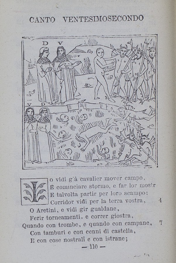 Dante e Virgilio vedono subito un diavolo che porta un dannato nella pece, mentre i suoi compagni lo tormentano con gli uncini. Virgilio induce Dante a nascondersi dietro una roccia, quindi va a parlare con loro (immagine 2). Gli si fa incontro il capo della pattuglia, il demone Malacoda. Virgilio tratta con lui il passaggio alla bolgia successiva.