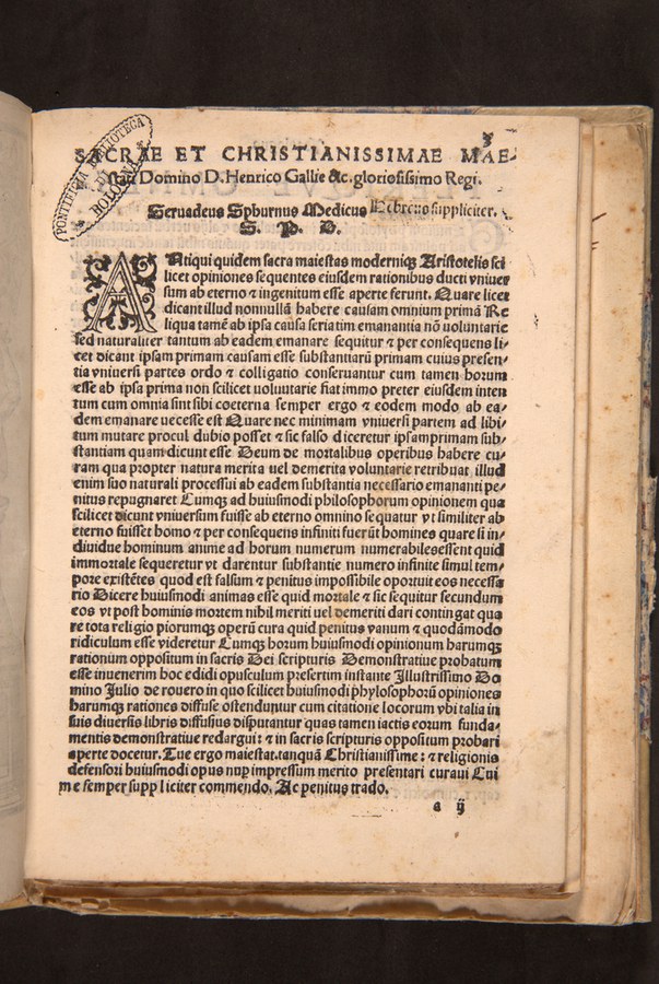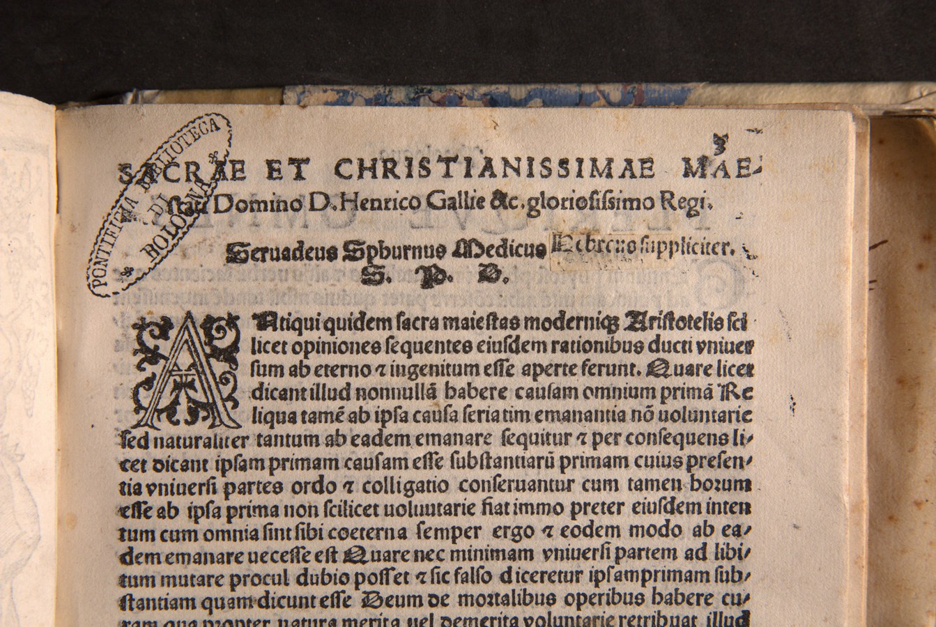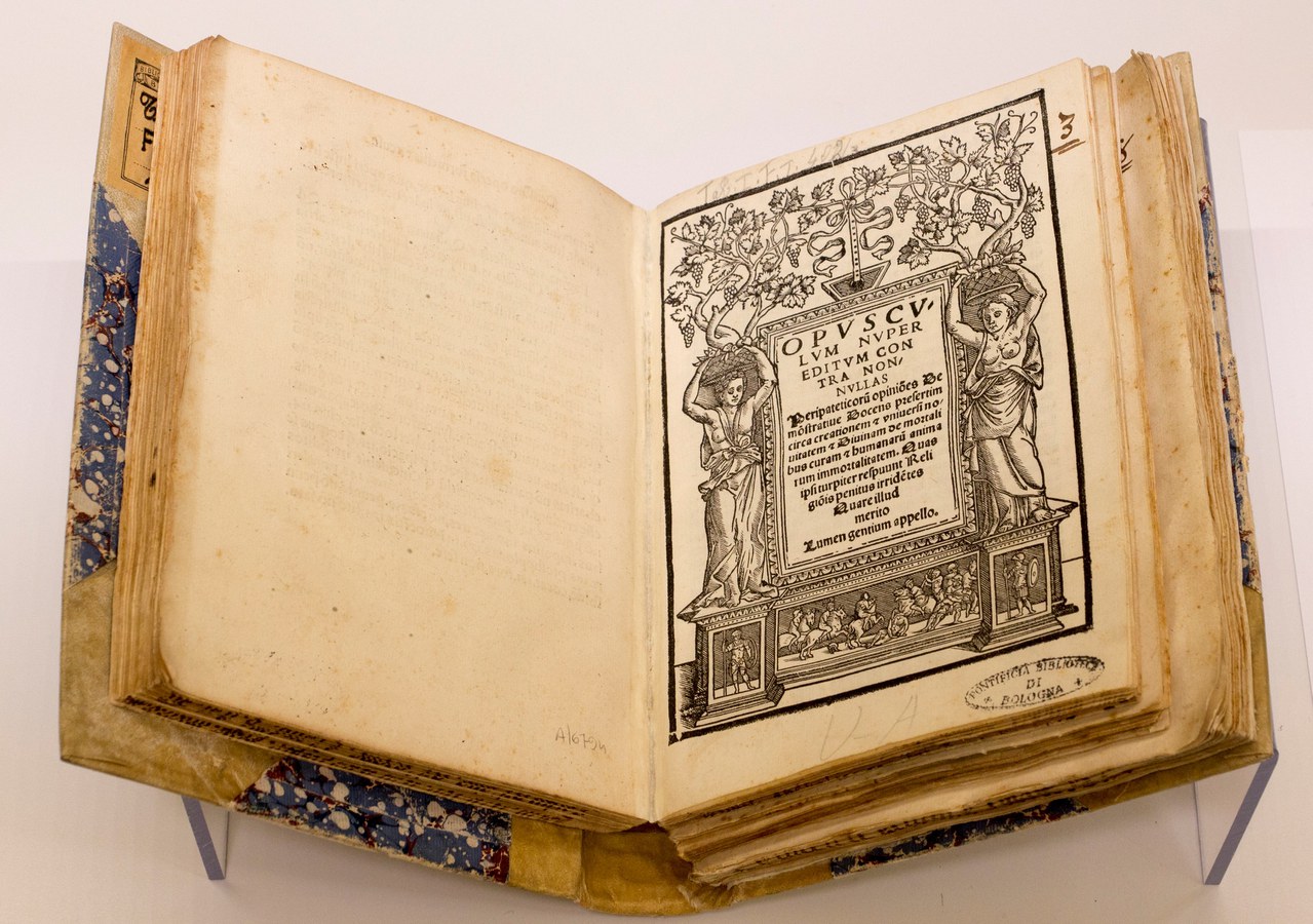 ‘Ovadyah (Servadio) Sforno (Cesena, ca. 1470 – Bologna 1550), laureato in medicina a Ferrara nel 1501, fu dal 1524 o 1525 medico e rabbino a Bologna, dove a partire dal 1536 si dedicò a promuovere la stampa di libri ebraici sia come autore, sia come redattore e correttore. A Bologna nel 1537 pubblicò in ebraico il trattato Or ‘ammim (Luce dei popoli), il cui manoscritto è conservato presso la Biblioteca Panizzi di Reggio Emilia, e la cui redazione latina curata dall’autore stesso è contenuta in questo volume, appartenuto al filosofo, medico, matematico e scienziato bolognese Ulisse Aldrovandi (1522-1605). Come recita il frontespizio, il trattato è «un’operetta pubblicata non molto tempo fa contro alcune opinioni dei filosofi aristotelici, dimostrando con argomenti cogenti la creazione e il mutamento dell’universo, l’attenzione divina per l’uomo e l’immortalità dell’anima, cose che essi vergognosamente ricusano, facendosi sonoramente beffe della religione».