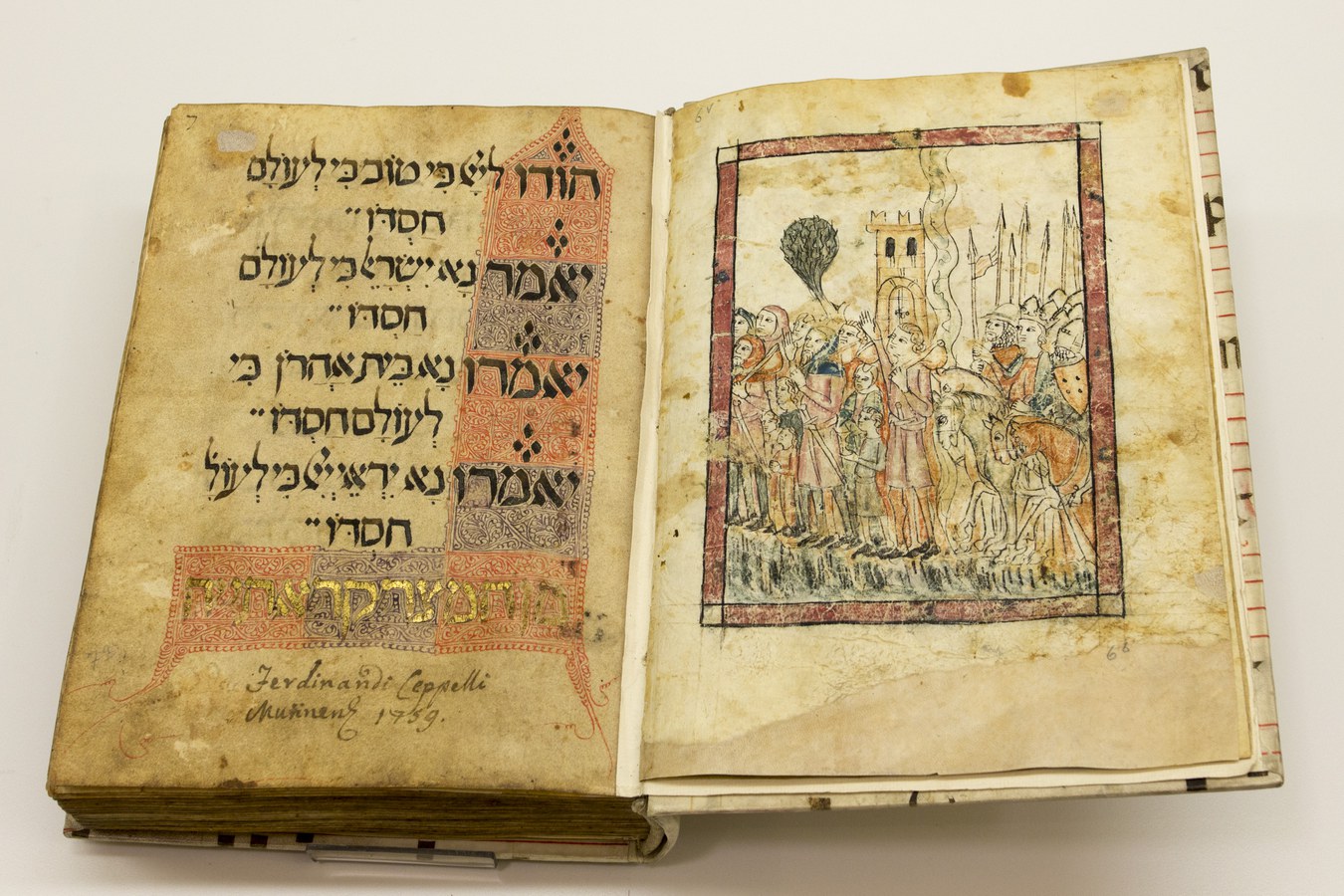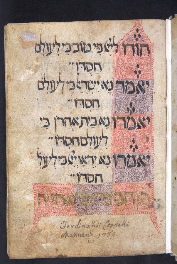 Contiene quasi esclusivamente testi di poemi liturgici o piyyuṭim; mancano la parte iniziale e diversi fascicoli tra il f. 6v. e il f. 7r, alcuni dei quali sono finiti nel ms. Modena, Biblioteca Estense Universitaria, ms. α.K.1.22 (catalogo di Bernheimer, 31), il quale è composto da quindici fogli che un tempo facevano tutt’uno con il nostro manoscritto e si concludono con il Salmo 117. Le prime sei carte contengono dodici disegni a penna che rappresentano: I: Aronne dietro a Mosè e la verga di questi trasformatasi in serpente, che ingoia le verghe dei maghi (f. 1r); II-XI: Le dieci piaghe d’Egitto (ff. 1v-6r); XII: il passaggio del Mar Rosso degli Ebrei incalzati dall’esercito del Faraone (f. 6v). I nomi dei personaggi e degli eventi sono scritti accanto a loro in grafia corsiva sefardita. Il manoscritto, posseduto nel Settecento da Ferdinando Ceppelli, fu portato a Parigi da Napoleone, come attesta il timbro della Bibliothèque Nationale, e ritornò a Bologna dopo la Restaurazione.