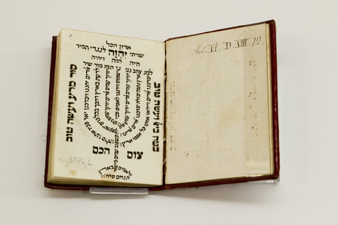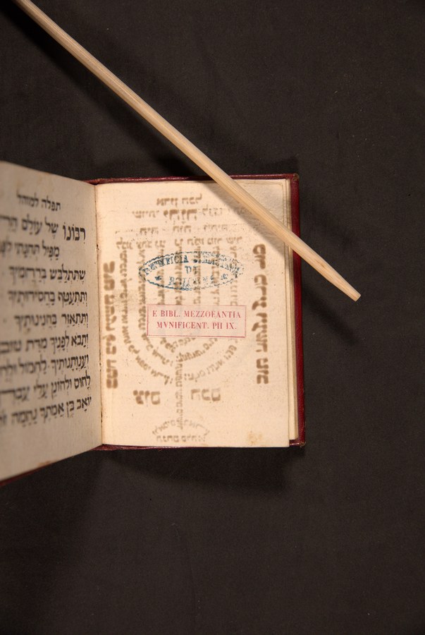 Sul frontespizio compare un testo in micrografia, disposto in forma di candelabro ebraico o menorah, con le parole del Salmo 67. Proviene dalla donazione del Card. Giuseppe Mezzofanti.