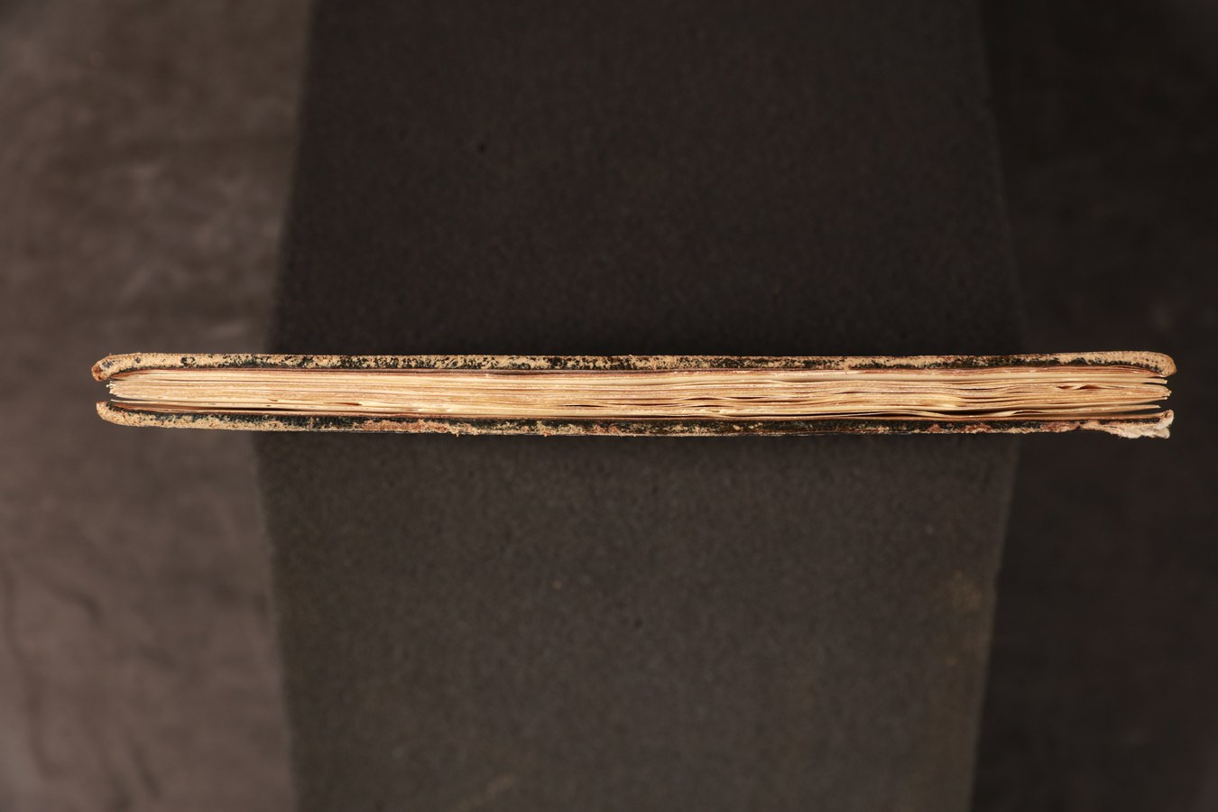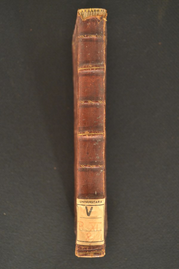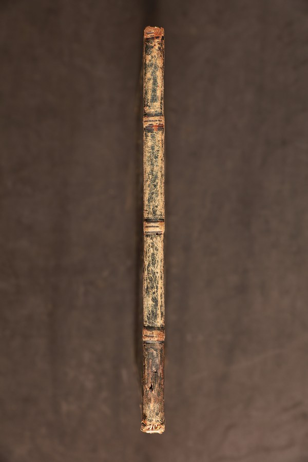 quattro tratteggiati. Indorsatura realizzata tramite alette orizzontali membranacee di recupero. Labbri muti. Rimbocchi rifilati senza particolare cura. Carte di guardia bianche. Tagli dorati incisi. Stato di conservazione: discreto. Cerniera indebolita al piatto anteriore. Angoli ricurvi.