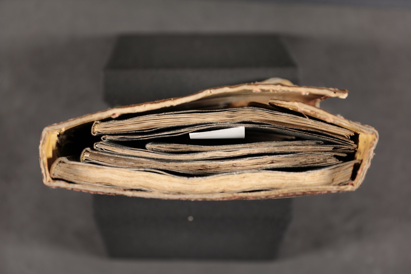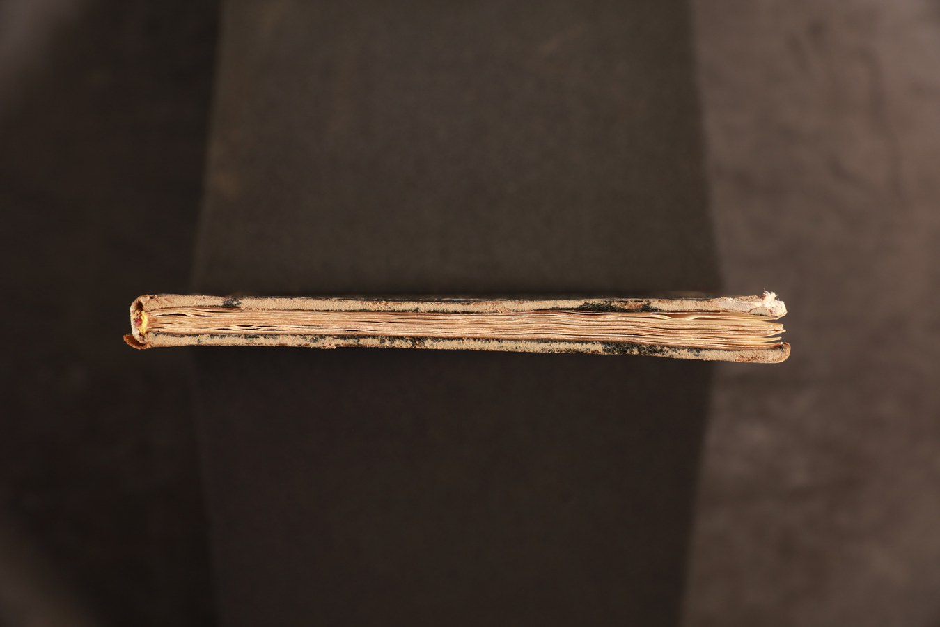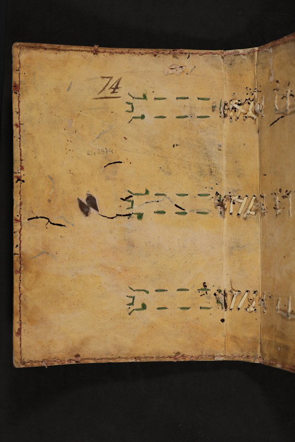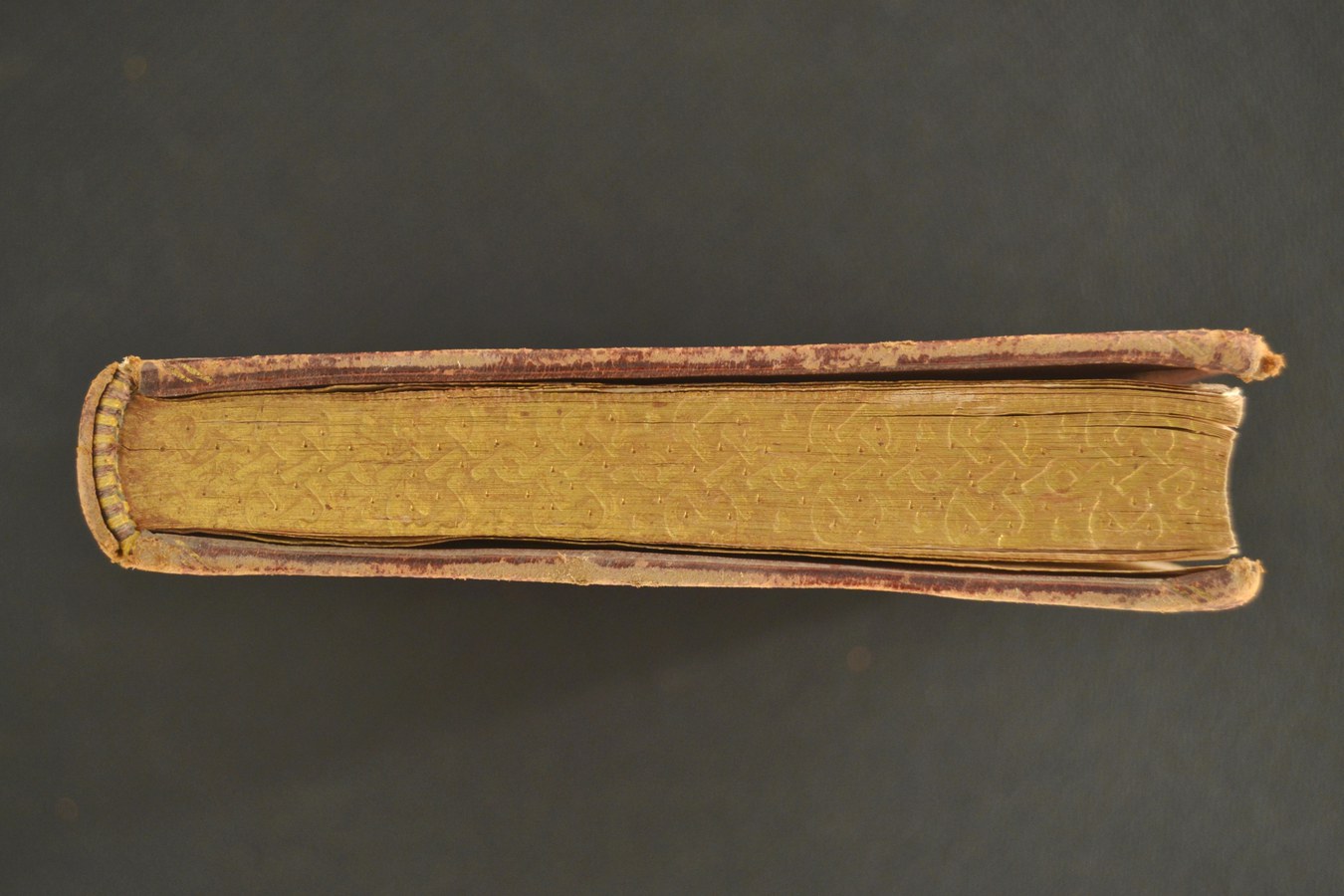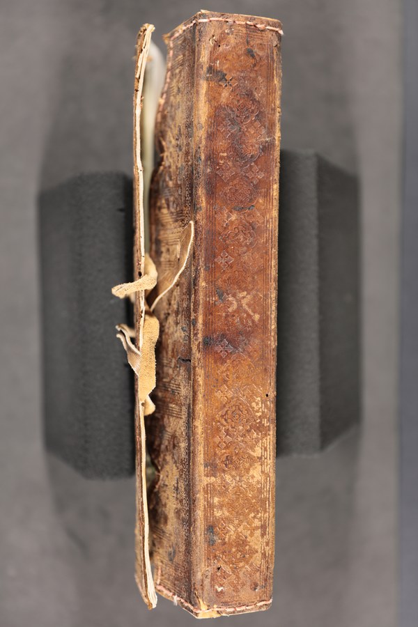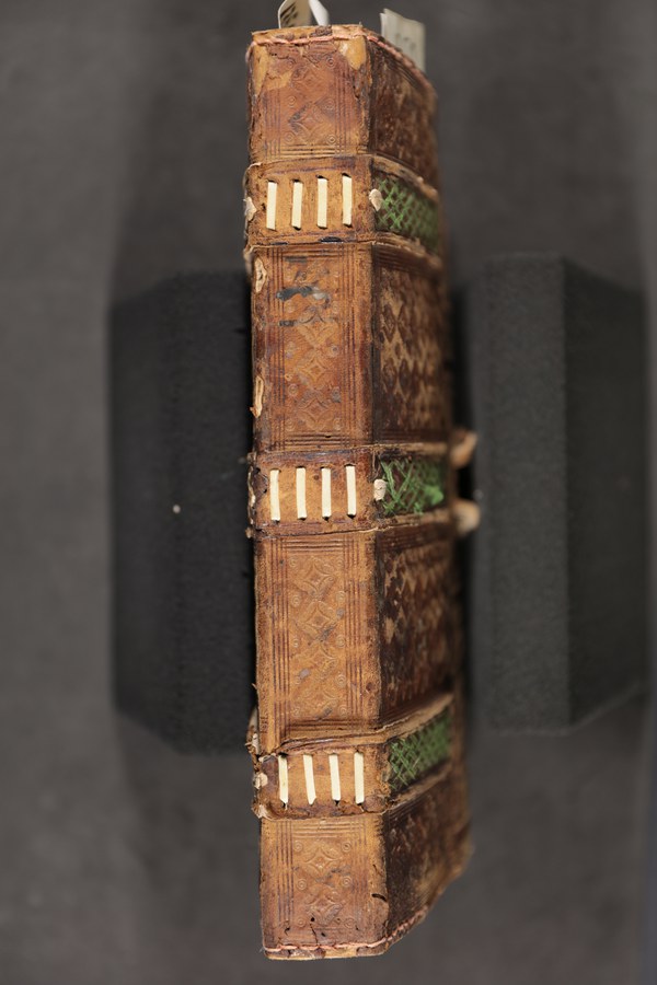 In evidenza i tre nervi a filetto centrale e tratteggiati, qui tutti funzionali al collegamento tra blocco e coperta: nelle produzioni rinascimentali italiane consistono invece solitamente in nervi strutturali alternati a cuciture apparenti.