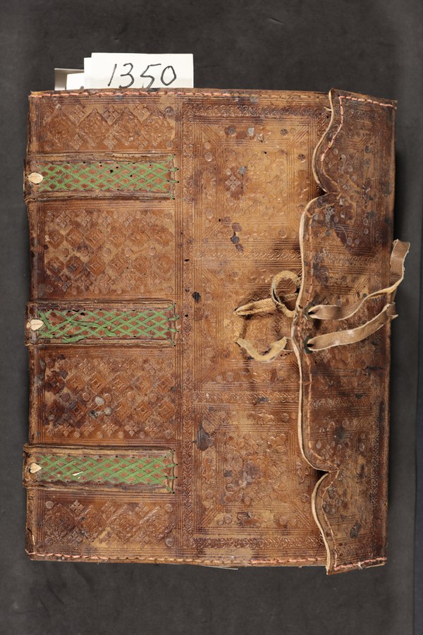Cuoio di bazzana marrone su quadranti in cartone decorato a secco. Impianto ornamentale caratterizzato da motivi fitomorfi, anche entro scimpartimenti. Laccio in cuoio rinnovato. Capitelli assenti. Cucitura su tre contrafforti a mezzo di lacci in pelle allumata. Indorsatura assente. Rimbocchi rifilati senza particolare cura. Carte di guardia bianche. Tagli rustici. Stato di conservazione: mediocre. Spellatura al materiale di copertura. Blocco avulso dalla coperta.