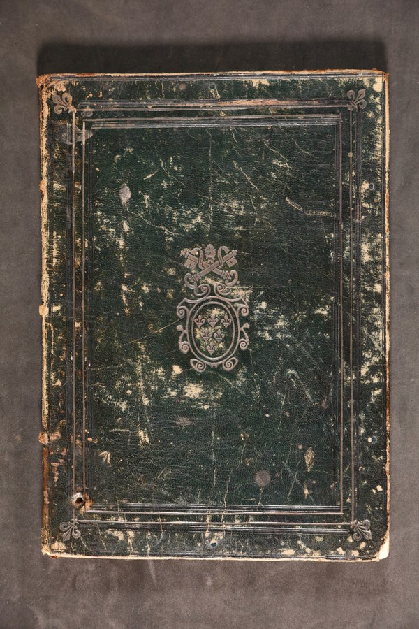 Cuoio di bazzana verde su quadranti in cartone decorato a secco e in lega d’oro. Filetti concentrici. Giglio negli angoli esterni della cornice. Armi riferibili al pontefice Paolo III (1534-1549) al piatto anteriore, prelatizie a quello posteriore. Tracce di quattro coppie di lacci. Capitelli in canapa. Cucitura su tre nervi rilevati in pelle allumata. Indorsatura realizzata tramite alette orizzontali membranacee. Labbri muti. Rimbocchi discretamente rifilati. Carte di guardia bianche. Tagli rustici. Stato di conservazione: mediocre - discreto. Diffuse spellature al materiale di copertura. Angoli incurvati.