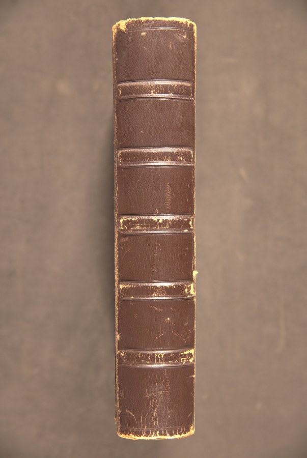 Cuoio di capra marrone su quadranti in cartone decorato a secco e in oro. Filetti concentrici. Coppia di cornici provviste di fregi stilizzati, coppie di archi e foglie cuoriformi. Capitelli muniti di anima circolare avvolta da fili in canapa e in lino marrone. Cucitura su sette nervi in pelle allumata, tre dei quali a filetto orizzontale centrale e