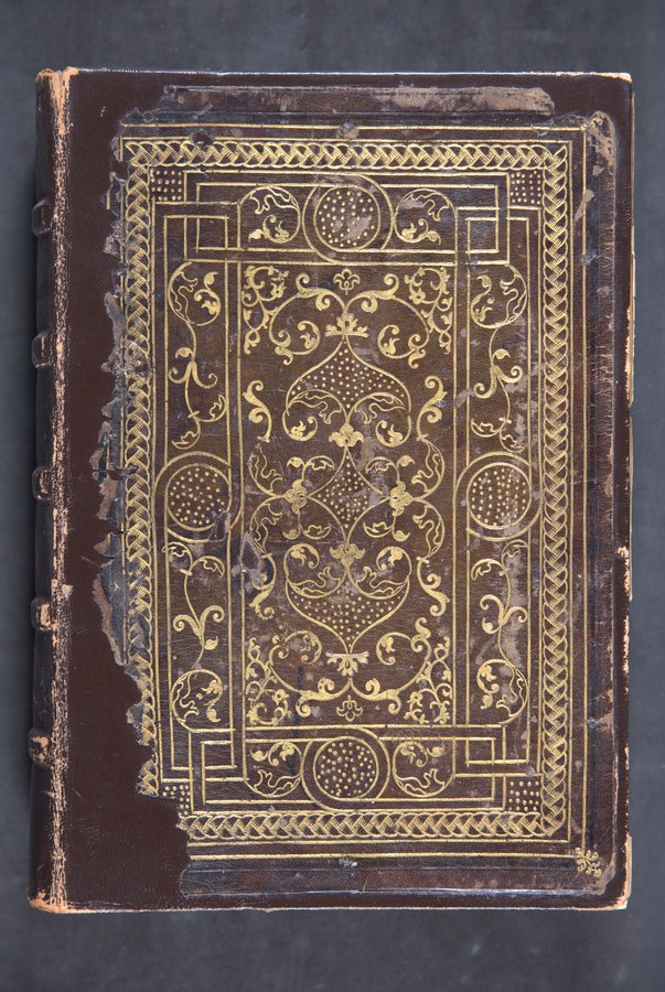 Cuoio di capra bruno su quadranti in cartone decorato a secco e in oro. Filetti concentrici. Cornice caratterizzata da motivo a torciglione. Nastri incrociati a delimitare gli scompartimenti provvisti di sfondi crivellati, motivi pieni e vuoti fitomorfi di gusto orientaleggiante. Tracce di quattro lacci. Capitelli, cucitura, indorsatura, rimbocchi, carta di guardia rinnovati. Labbri muti. Tagli dorati. Stato di conservazione: mediocre. Spellature al materiale di copertura originale, scomparso lungo il dorso. Volume restaurato.