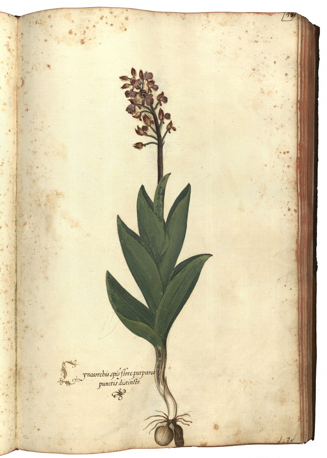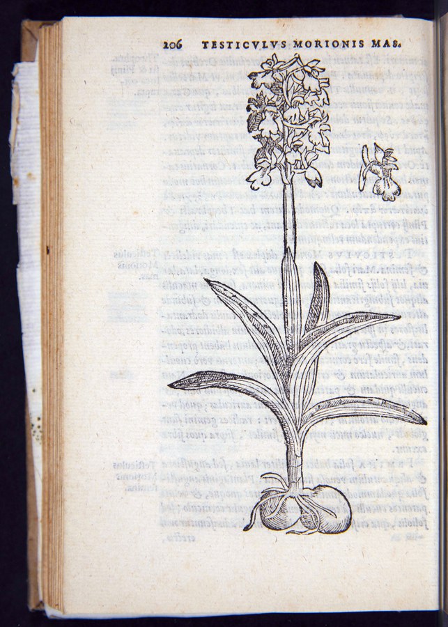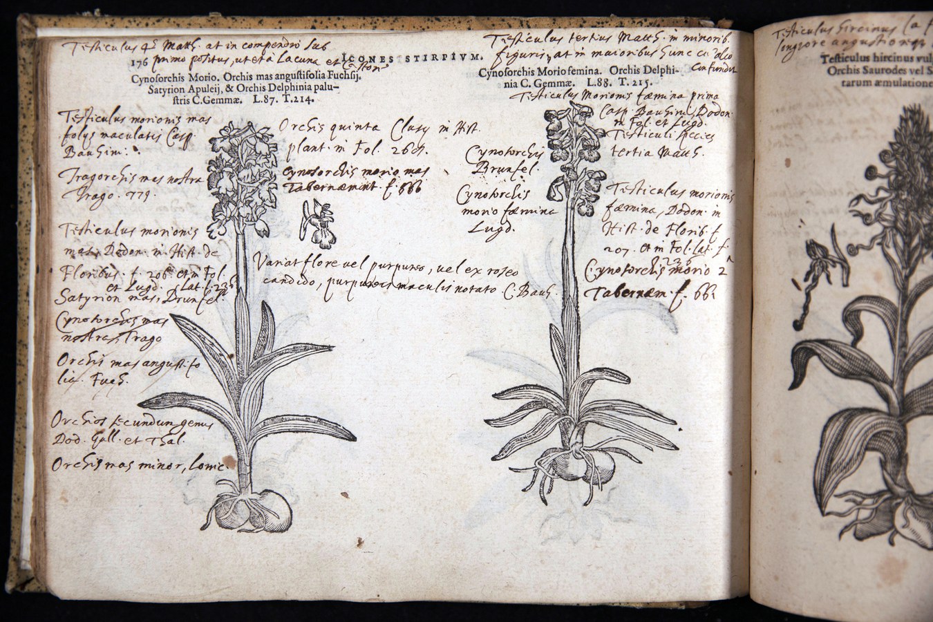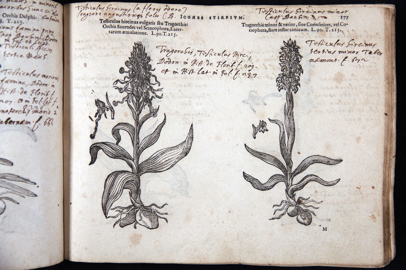 Alle orchidee L’Obel dedica diverse pagine che nell’esemplare appartenuto ad Aldrovandi sono affollate di note a margine. Questi aveva sicuramente ricevuto il compito di collazionare diversi testi di iconografia dedicati al mondo vegetale e di prendere nota dei nomi delle piante presenti nelle trattazioni degli altri autori.